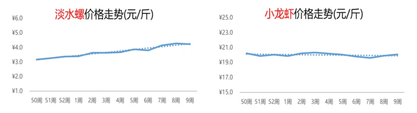 前期受春节备货的推动,活鸡行情连涨3周,但是市场整体的供应依旧偏宽松,价格继续上涨动力不足。第9周,活鸡的价格为9.5元/斤,环比下跌6%,但同比上涨16%。春节过后,市场对鸡蛋的采购需求减少,多以消耗库存为主,蛋价出现回落。本周,鸡蛋的价格为5.8元/斤,环比、同比跌幅分别为2%和12%。4.2水产:淡水螺价格轻微回撤,小龙虾行情小幅上扬