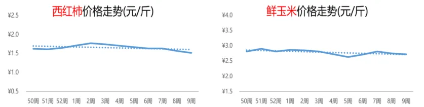 淡水螺的价格在上涨至近3个月高点4.3元/斤后,开始有所回调。第9周,淡水螺的周均价为4.2元/斤,环比下跌1%,但同比上涨3%。目前,小龙虾上市量整体偏少,市场行情呈现小幅上涨态势。本周,小龙虾的价格为20.1元/斤,环比小幅上涨1%,但同比下跌20%。4.3 蔬菜:西红柿价格跌势不止,鲜玉米行情略显疲软