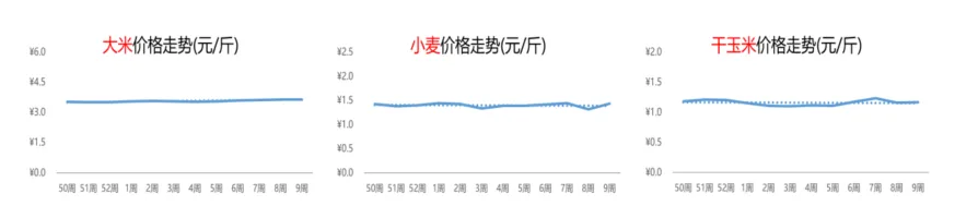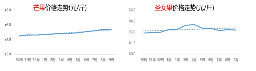 本周,西红柿的价格为1.5元/斤,较前一周下跌3%,较去年同期上涨28%。西红柿价格不断下滑主要是受到产地增多和上市量增加等因素的影响。节后菜价整体回落,市场选择性多样,对鲜玉米的需求较为平淡,导致价格偏弱。第9周,鲜玉米的周均价为2.7元/斤,与上周相比下跌1%;与去年同期相比,上涨11%。4.4 水果:芒果价格停止上涨,圣女果行情涨跌交替自元旦以来,芒果价格持续走强,连涨8周,但本周芒果行情涨势暂停,周均价环比小幅下跌1%至5.3元/斤,同比上涨7%。近期,圣女果市场价格有涨有跌,波动频频。第9周,圣女果的价格为3.3元/斤,与上周相比下跌1%;而与去年第9周相比,上涨20%。4.5 粮食:大米和干玉米价格平稳,小麦行情转好