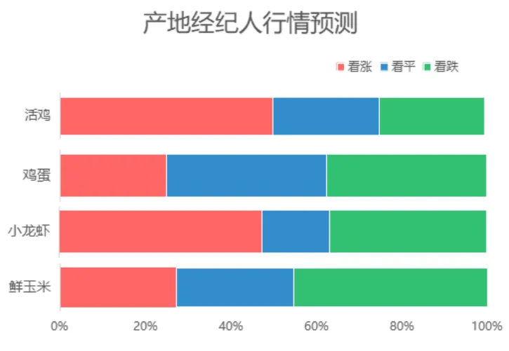 据产地经纪人对热门品类后市行情预测:活鸡后市行情以涨为主,看涨的比重占一半;鸡蛋后市价格大概率稳中偏弱,看稳和看跌的合计比重为75.0%;小龙虾方面,看涨和看跌各占一定的比重,但看涨的比重稍多一些;鲜玉米方面,看跌的比重为45.5%,略高于看涨和看稳。湖南惠农科技有限公司