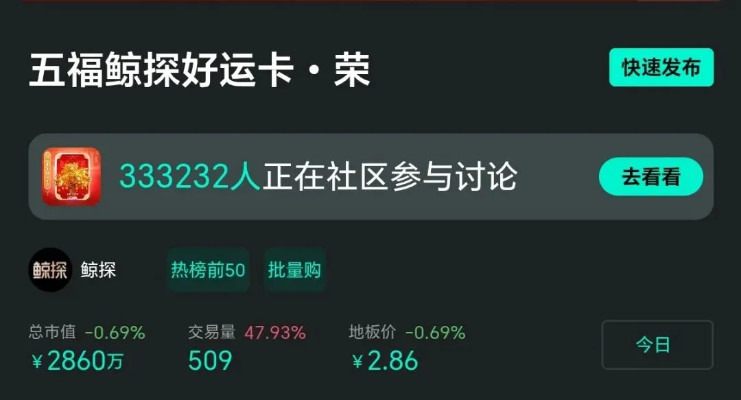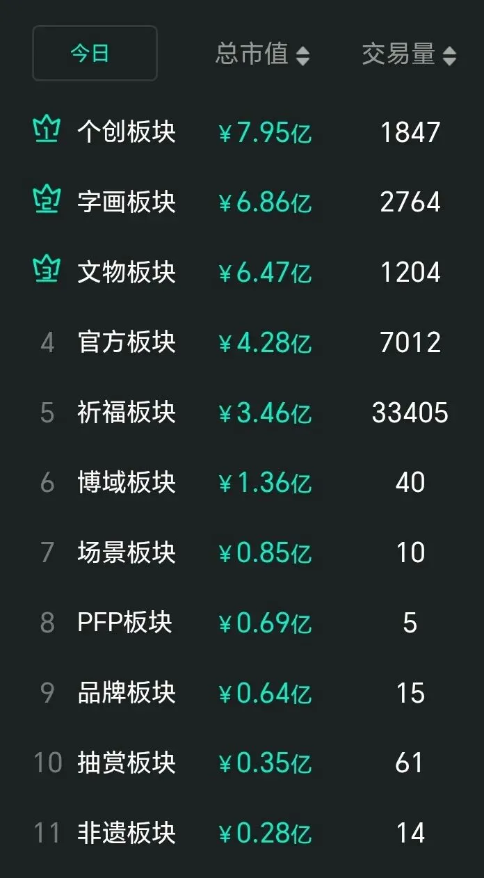 目前,成交量排在前列的是1元左右的低价小藏品,这或许表明市场存量资金已经不多,无法支撑购买其他高价藏品。