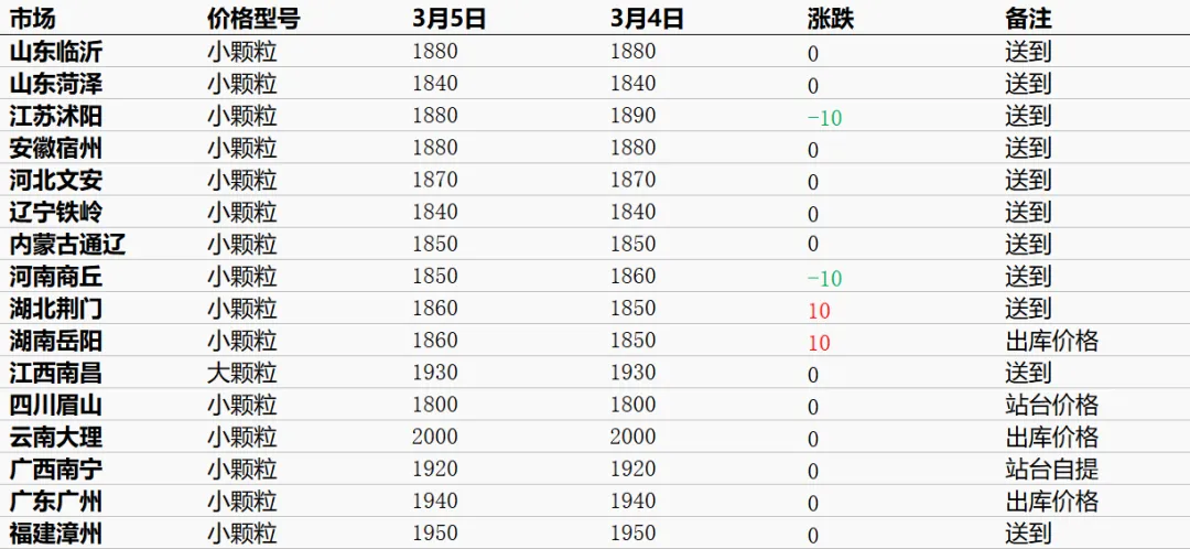 今日国内尿素市场偏弱推进,主流尿素工厂依旧报价稳定,但实际成交明显走弱,个别企业小幅下调报价,成交一般。储备货源陆续释放,价格低于当前出厂报价,以及受指导价影响,市场情绪转弱,工业开工尚未集中恢复,工农业需求未有完全衔接,行情暂时偏弱中小幅松动。【明日预测】短期内无明显利好支撑之下,市场价格或将出现松动表现。3月5日国内尿素主要市场价格汇总