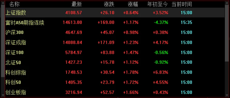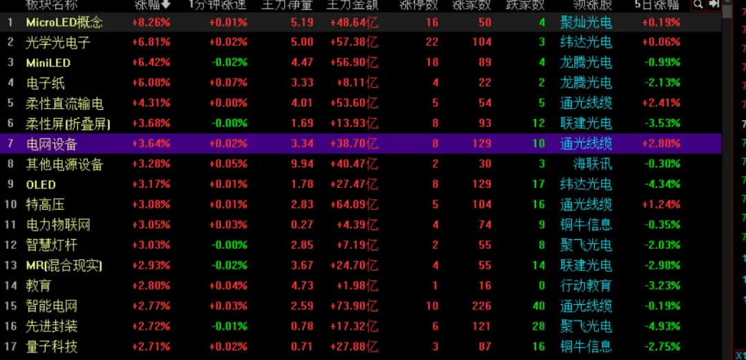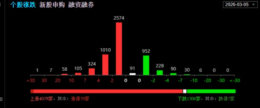 周四指数,沪指早盘高开低走,全天零轴上方宽幅震荡,最高上涨至4125点附近,最低4090点,三大股指齐涨,创业板指收涨1.66%,光学电子迎来涨停潮,科技题材全面爆发。全天4079家上涨,1306家下跌,108家涨幅超9%,307家涨幅超5%,12家跌幅超9%,70家跌幅超5%,整体赚钱效应较好。截止收盘,沪指收4108.57 涨0.64%,深成指收14088.84 涨1.23%,创业板指收3216.94 涨1.66%,两市成交2.39万亿,较前一日稍有放量。板块方面,盘面 MicroLED 有望凭借节能优势成为光互联替代方案,光学电子相关板块闻声大涨,集体涨停板,其次电力电网依旧是机构主攻方向,板块继续创出新高。泛科技方向,先进封装,量子科技,通信服务等涨幅居前领跌方向,转基因,油气开采,种业,贵金属,燃气,小金属等资源类品种跌幅居前MicroLED概念:聚灿光电,华灿光电,聚飞光电, 艾比森,联建光电,雷曼光电,瑞丰光电,美迪凯20cm,华兴源创,隆利科技,鸿利智汇,利亚德,洲明科技,乾照光电,联合光电涨幅超10%,冠捷科技,国星光电,奥拓电子,三安光电, 同兴达,沃格光电,兆驰股份,芯瑞达涨停光学光电子:纬达光电,龙腾光电20cm,恒泰照明,秋田微涨幅超11%,欧菲光,亚世光电,华塑控股,深纺织A,华映科技涨停智能电网:通光线缆20cm,昇辉科技,宏力达涨幅超14%,百利电气,中国西电,三晖电气,顺纳股份,中超控股,积成电子,汉缆股份,保变电气涨停量子科技:铜牛信息20cm,国盾量子涨幅超10%,神州信息涨停固态电池:美利信涨幅超13%,方大炭素,雄韬股份,泰坦股份, 振华股份,上海电气涨停隔夜美股触底反弹,中东局势迎来缓解,短期不会派遣地面部队进入伊朗,期货市场迎来回调,早盘相关概念也是开盘直接打出低点;亚太方面韩国综合指数跳空大涨超10%,带动整个情绪上扬,A股今天也是一度涨幅超1%,跟风情绪明显。技术面,今日再次收取一根假阴真阳,正好回补昨日缺口4117附近,量能则是连续三日大幅萎缩,均线级别继续承压,空头情绪较为浓厚;市场预判:由于中东局势还在不断发酵,那么未来一段时间看空行情预计还会延续,昨天预测缺口回补,今天也是直接完成了,就看明天指数是否继续反包前期阴柱,一旦反包指数继续上扬,反之未来大概率就是震荡下跌模式。指数方面, 两会期间,将会有不间断的代表人发言来刺激市场概念的异动,在此期间个人认为市场会围绕4000-4200之间震荡,再精确一点就是围绕4100点附近震荡,大趋势得看短期内是否站上中短期均线,如没有的话那么可能会走出一个重心下移的可能性;毕竟3月份重要会议较多,4月份业绩集中披露期。当前较为确定的路线就是 新基建 方向 ;算力,以及民生,工业制造 都离不开电;电力,电网,核电等领域还将进一步加大科技研发和布局;其次就是中东局势,这个局部行情依旧是尚在的,切勿追高即可,因为吃消息较多。