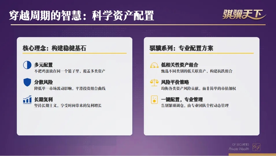 广发证券的骐骥各类别资产配置系列,通过组织不同市场的股票、债券及另类资产,构建低相关性的组合并运用风险平价的方法论,助力投资者穿越市场周期,是应对今年结构性市场的好方法。