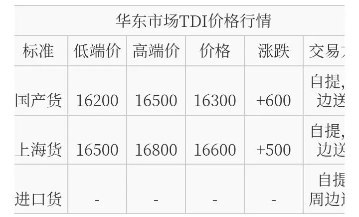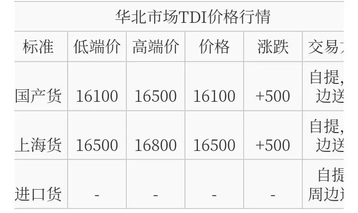 华北TDI国产货报盘价格在16100-16500元/吨,上海货报盘价格在16500-16800元/吨。