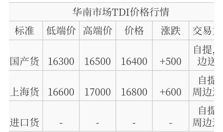 华南TDI国产货报盘价格在16300-16500元/吨,上海货报盘价格在16600-17000元/吨,存更高价格听闻。