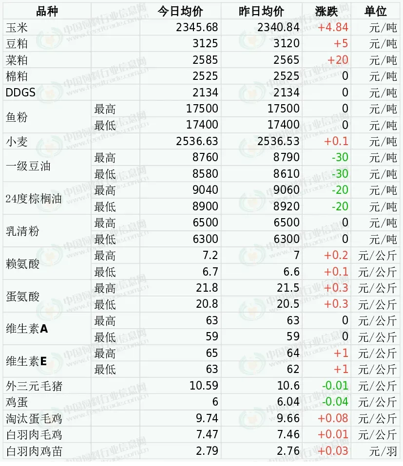 5日DDGS价格坚挺。近期原粮玉米价格持续上涨,酒精企业挺价心态增加,下游采购情绪较好,部分酒精企业成交较好,企业DDGS库存压力逐步降低,支撑DDGS价格偏强运行。预判3月份期间产区DDGS交易价格总体稳中略显偏强走势为主的可能性更大,月度均价环比止跌转上涨的几率在逐步提高。因市场对中国需求前景存有疑虑叠加南美大豆丰产在望,收割后季节性供应压力逐渐增加,CBOT大豆期货收盘略微下跌,基准期约收低0.1%。巴西大豆产量下调以及收割进度延迟支撑美盘大豆高位运行,并带动进口成本出现上涨。国内油厂开工率快速攀升,豆粕产量增加,油厂库存下降但养殖需求逐渐清淡,饲料养殖企业和贸易商采购心态谨慎,豆粕库存在开机增加的情况下或处于增加的趋势,目前豆粕价格因需求清淡导致供应宽松而出现偏弱整理行情。今日棉粕市场价格总体持稳。巴西大豆产量下调以及收割进度延迟支撑美豆高位运行,成本端不支持目前粕价深跌。而棉粕产出恢复慢,供应端压力不大。需求端,对棉粕需求保持平稳,无明显增量。预计棉粕价格震荡调整。今日郑州菜粕期货低开后震荡调整。加拿大油菜籽期货收盘上涨,基准期约收高0.4%,追随芝加哥豆油市场的涨势。菜粕现货小幅调整,水产需求恢复较慢,叠加供应预期改善限制菜粕涨幅空间,将继续窄幅偏弱震荡调整。外盘方面,秘鲁鱼粉厂商对厄尔尼诺影响的担忧,心态坚挺,其中秘鲁新季超级蒸汽鱼粉预售参考价格为CNF2350美元/吨;捕鱼方面,2026年1月-3月1日秘鲁南部捕鱼量共计141987吨,剩余配额数量109013吨。国内进口鱼粉市场,价格高位运行,当前秘鲁超级蒸汽鱼粉价格集中在17400-17500元,短期鱼粉偏强走势继续。今日小麦市场价格整体稳为主、局部偏强。主产区受雨雪天气影响,基层散粮流通受阻、到货量普遍偏低,农户惜售、贸易商出货谨慎,市场有效供应偏紧。面粉消费处于淡季,粉企多以稳价观望、按需采购为主,仅局部企业小幅提价促收。昨日CBOT豆油市场震荡收高,保持强势运行节奏。昨日马来西亚棕榈油市场反弹遇阻小幅回落,受到获利了结情绪的打压,夜盘维持回调状态。国内油脂供应整体宽松,需求淡季令油脂板块主动上涨动力仍显不足。原油上涨的外溢效应犹存,中东局势仍是影响近期国内外植物油市场走势的关键。受国内油厂开机回升、豆油库存高位影响,叠加市场处于传统消费淡季,终端需求低迷,现货缺乏上涨动力,虽外盘油脂高位震荡带来一定成本支撑,但国内供需偏弱主导行情,预计近期豆油现货维持震荡运行。中美贸易冲突缓和,互相取消额外的商船岗务费,国内港口乳清粉到货量趋于好转,大猪仔猪价格低迷,乳清粉市场报价稳中偏弱整理,后续需注意关税谈判进展以及港口库存量等因素。2025年12月,我国赖氨酸与赖氨酸盐及酯的出口量为9.8万吨,同比增0.4%,环比增8.4%。3月2日金玉锋98%赖氨酸报价6.6元/公斤,70%赖氨酸报价4.6元/公斤。3月3日起星湖伊品氨基酸产品上调200-300元/吨。市场成交上行。2025年12月国内蛋氨酸进口量为2.1万吨,同比增10.6%,环比增66%1月8日市场称宁夏紫光蛋氨酸价格上调7%。1月30日市场称安迪苏液蛋提价10%。2月3日起新和成固蛋出口报价提升8%。2月27日市场称安迪苏液蛋计划提价1元/公斤。3月4日市场称固蛋厂家多为停报。欧洲VA1000市场报价15-16欧元/公斤。10月28日市场称部分厂家报价提至70-72元/公斤。2026年1月6日新和成VA提价至70元/公斤。2026年1月15日市场称浙江医药VA提价至75元/公斤。欧洲VE市场报价5.5-5.8欧元/公斤。1月13日市场称浙江医药VE产品提价至72元/公斤。1月22日市场称浙江医药昌海生物分公司计划自2月初起停产约4周。2月5日市场称新和成VE产品出口报价上调15%。3月3日市场称帝斯曼VE提价至75元/公斤,3月4日市场称国内主要厂家停报,VE市场偏强运行。全国均价为 10.59元/公斤,较昨日价格下跌0.03%。当前供应端偏宽松,前期压栏大猪、规模场出栏增加叠加冻品库存偏高,市场供给充足;需求端处于节后淡季,消费偏弱、屠企持续压价收购,养殖端亏损扩大。预计近期仍低位震荡。今日鸡蛋价格稳中偏弱。供应端库存偏高,老鸡淘汰偏缓,整体货源充足;需求端处于节后淡季,终端消费疲软走货一般。饲料成本相对稳定,养殖多处于保本或微利状态,市场情绪分歧较大。预计近期鸡蛋价格或将窄幅震荡。今日主产区山东鸡蛋均价5.94元/公斤,与昨日价格持平;河北鸡蛋均价5.58元/公斤,较昨日价格下跌0.12;广东鸡蛋均价6.27元/公斤,与昨日价格持平;北京鸡蛋均价6.10元/公斤,较昨日价格下跌0.10 。全国淘汰蛋毛鸡均价稳中有涨。市场购销偏淡,屠宰企业采购谨慎。因前期淘鸡量少、货源偏紧支撑价格高位,但鸡蛋行情偏弱使得养殖端淘汰意愿有所增加,对淘鸡价格形成压制,预计近期淘汰鸡价格仍将震荡偏弱。今日山东地区淘汰蛋毛鸡均价10.20元/公斤,与昨日价格持平;江苏地区淘汰蛋毛鸡均价10.60元/公斤,较昨日价格上涨0.20;辽宁地区淘汰蛋毛鸡均价10.00元/公斤,较昨日价格上涨0.20。白羽肉毛鸡价格整体稳定。养殖端出栏集中、供应宽松,屠宰企业复工但收购谨慎、压价明显,终端消费疲软、走货不畅,叠加饲料成本高位、养殖利润微薄,预计近期白羽肉鸡价格或仍将窄幅震荡。今日主产区山东白羽肉毛鸡均价7.08元/公斤,与昨日价格持平;辽宁均价7.59元/公斤,与昨日价格持平