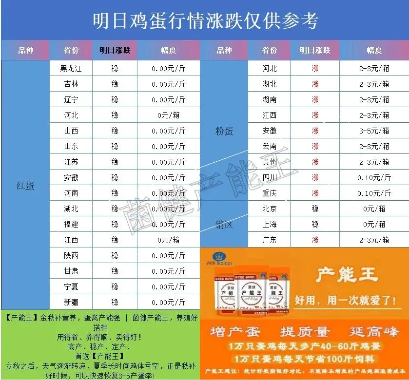 红蛋主产区明天整体企稳,局部地区小幅调整,大跌大涨的可能性不大。预计下周红蛋地区会逐步偏强,但大家也不要抱有过高期待,因为目前各地区走货速度依然不快,终端需求没有明显放量,经销商拿货相对谨慎,库存消化缓慢,所以即便上涨,上涨空间也比较有限,以小幅回升为主。