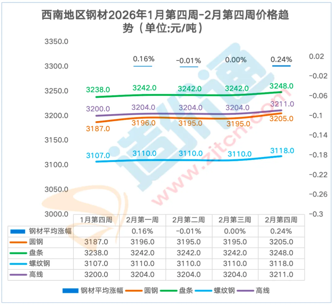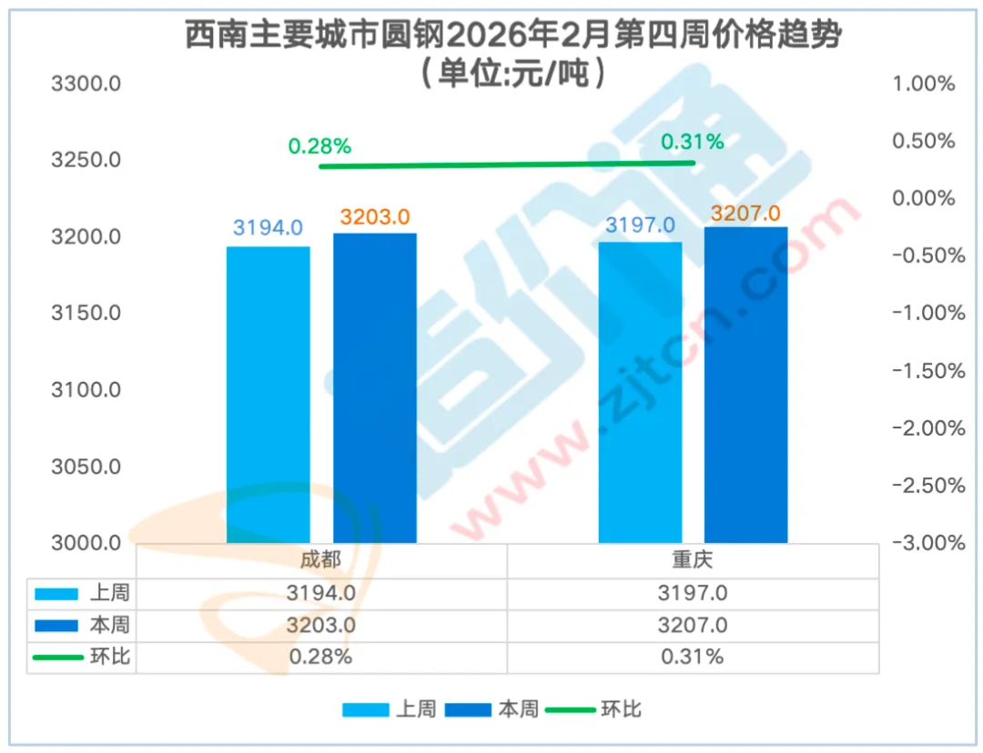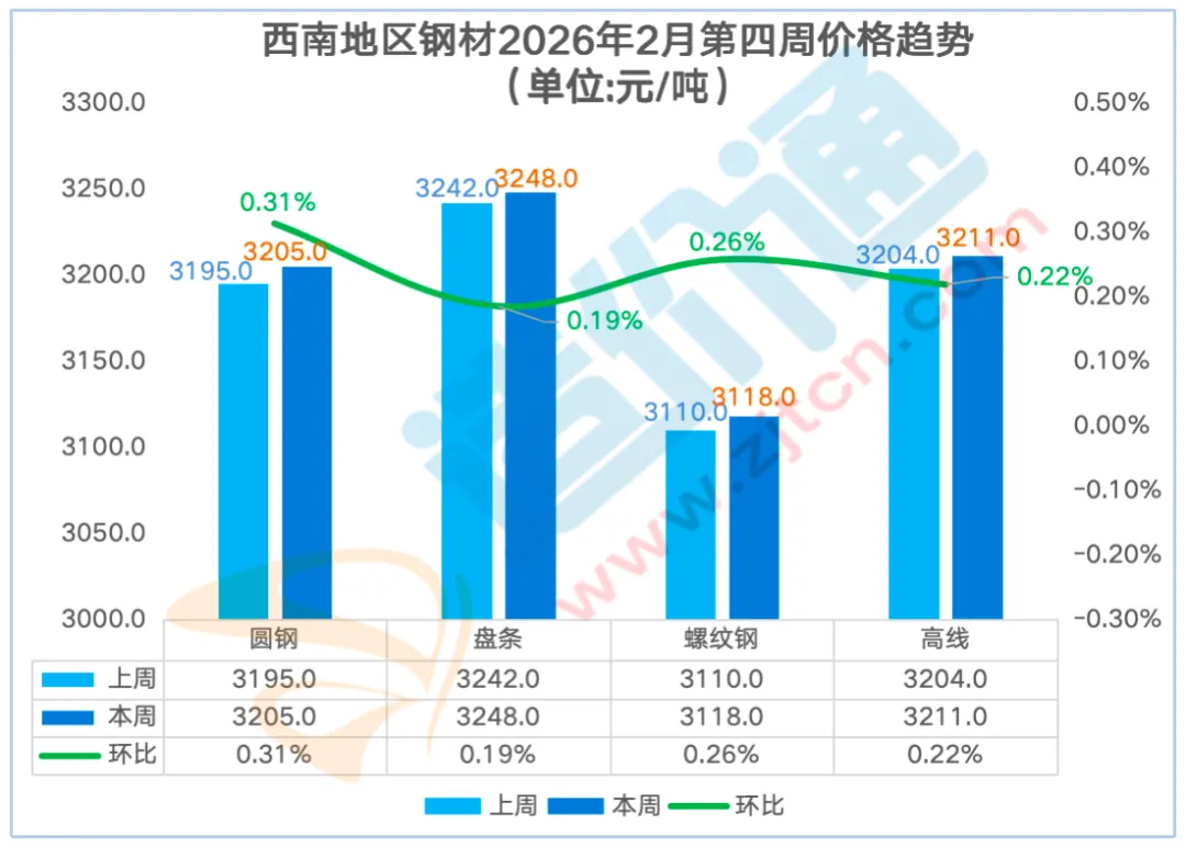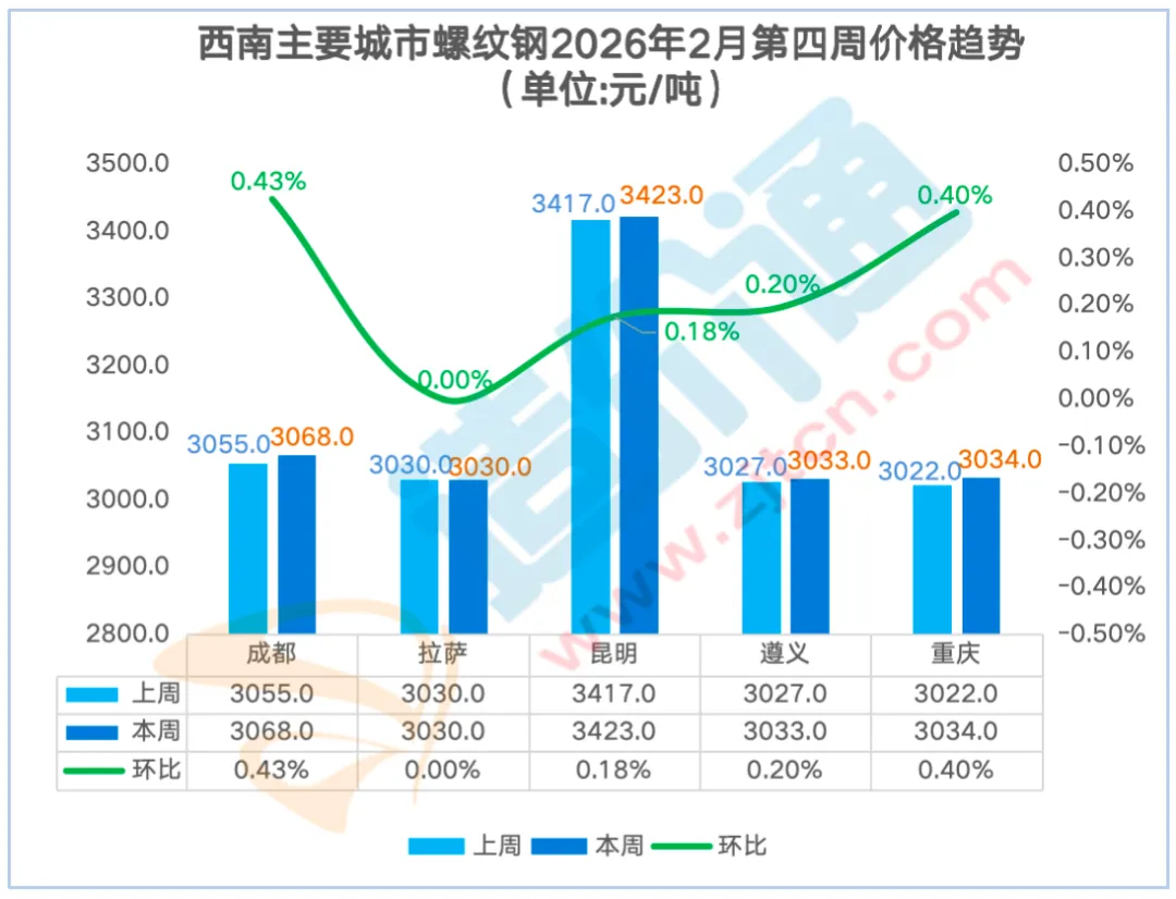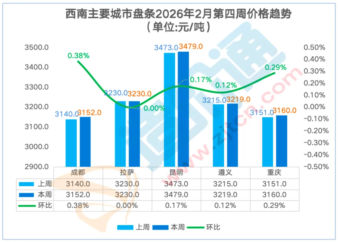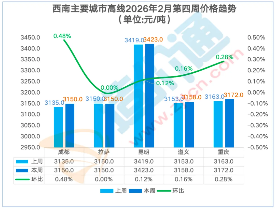 高线:最近一周成都、昆明、遵义、重庆高线价格呈上升态势,环比涨跌幅在0.12%~0.48%;其中成都本周环比涨跌幅为0.48%,昆明本周环比涨跌幅为0.12%,遵义本周环比涨跌幅为0.16%,重庆本周环比涨跌幅为0.28%,其余城市价格均无波动。