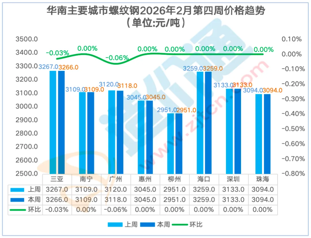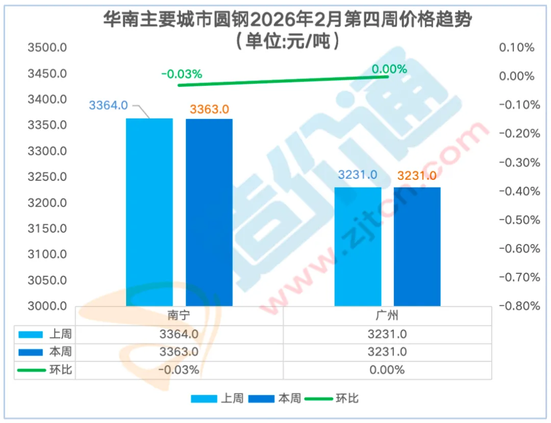 圆钢:最近一周南宁圆钢价格呈下跌态势,南宁本周环比涨跌幅为-0.03%,其余城市价格均无波动。