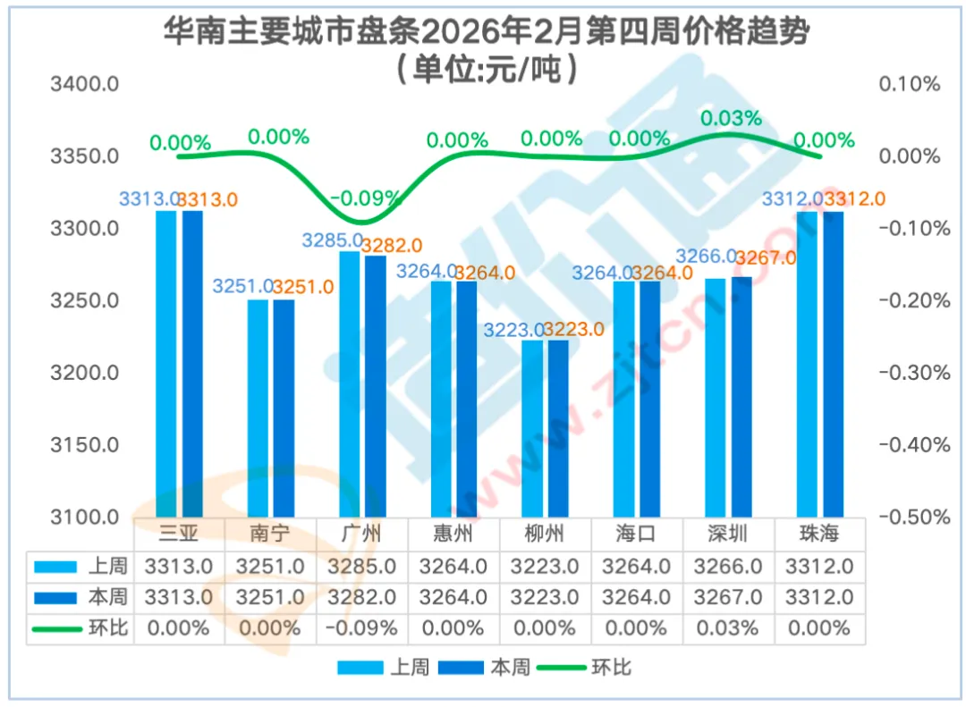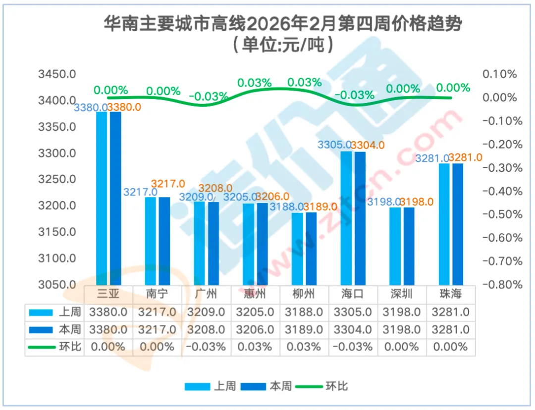 高线:最近一周广州、惠州、柳州、海口盘条价格呈涨跌互现态势,环比涨跌幅在-0.03%~0.03%;其中广州本周环比涨跌幅为-0.03%,惠州本周环比涨跌幅为0.03%,柳州本周环比涨跌幅为0.03%,海口本周环比涨跌幅为-0.03%,其余城市价格均无波动。