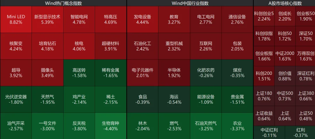 行情回顾:今天大盘高开横盘震荡,维持2.41万亿成交量,超过4000家上涨,其中电力设备和新型电缆传输技术Mini LED领涨。中小盘相对强势。