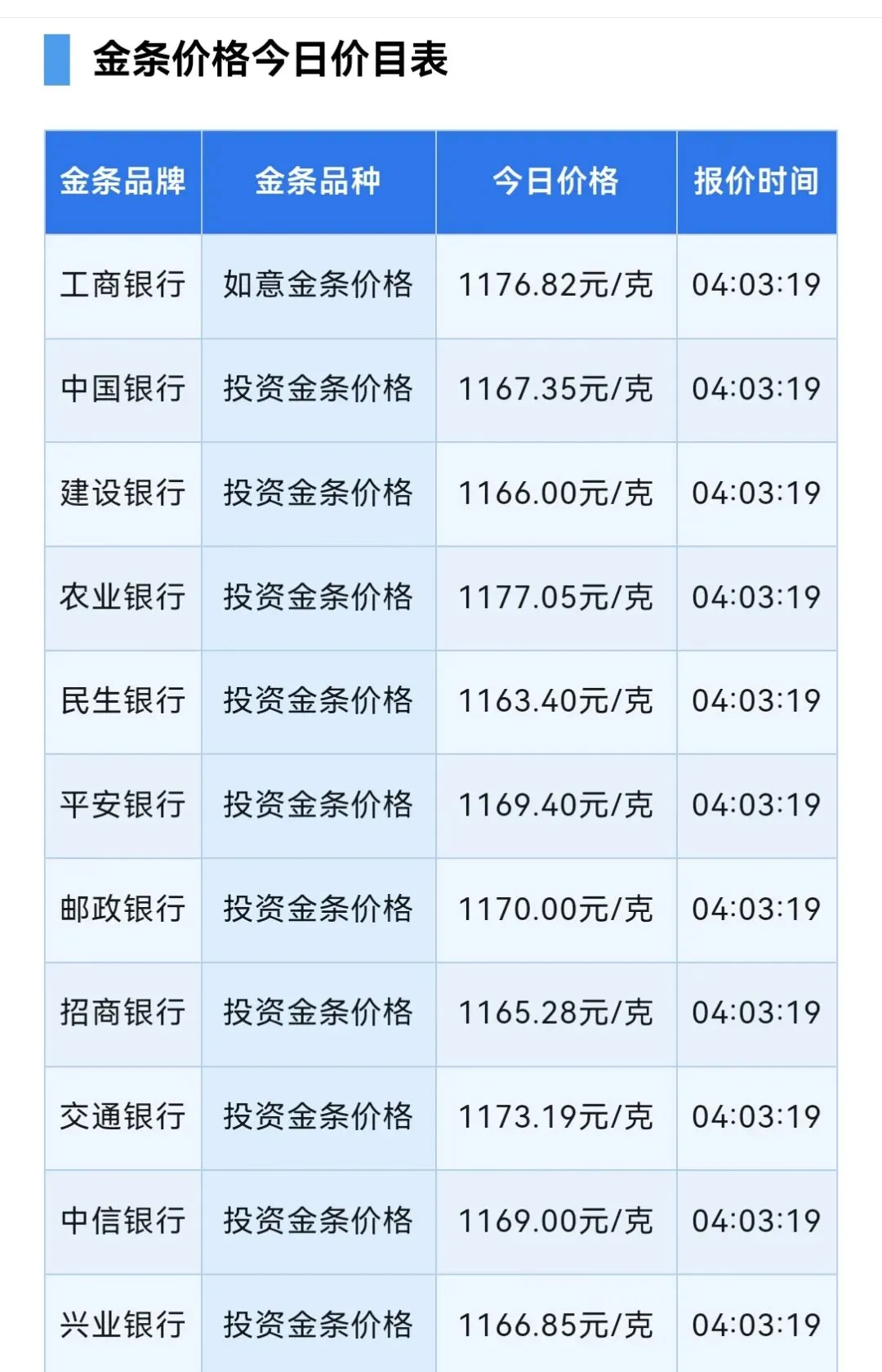 银行金条主要有分为投资金条和收藏类金条(工艺类金条),其中收藏类金条精美,适合送礼与收藏,不过溢价也会较高一些。大多数人购买金条是为了投资,因此在金条购买方面主要还是以投资金条为主。金条价格:银行投资金条小幅上涨,建行1166元/克,工行1176.82元/克,中行1167.35元/克。