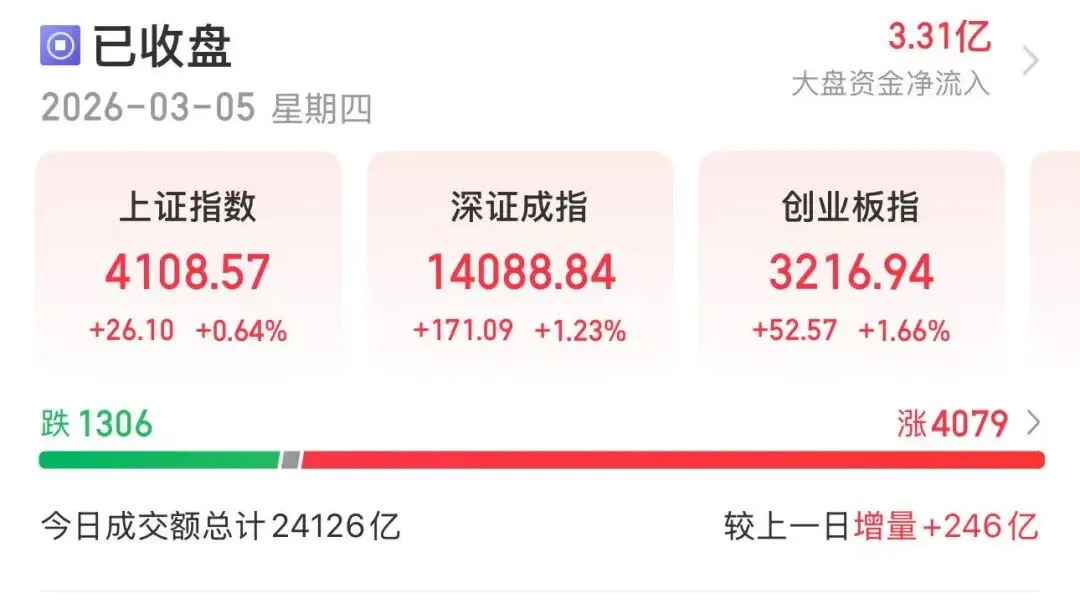 今天 A 股彻底扬眉吐气!在中东局势持续升级、外围市场震荡的背景下,大 A 走出独立强势行情,沪指收涨 0.64% 站稳 4100 点,深成指大涨 1.23%,沪深 300 涨 0.98%,个股超 4000 家飘红,中位数收涨 0.82%,憋屈多日的赚钱效应全面回归!