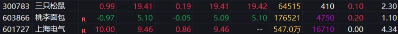 波段票:三只松鼠和桃李面包持有。上海电气涨停,不多讲。