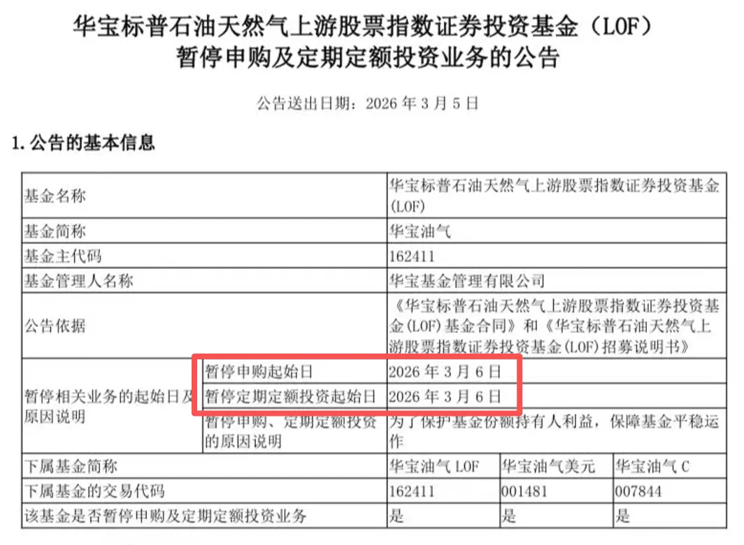 顺便说一句,之前发文的华宝油气LOF套利(油气LOF套利,赚点确定性的小钱)发布公告,3月6日起暂停申购,因此套利通道关闭,耐心等待下一次的机会!