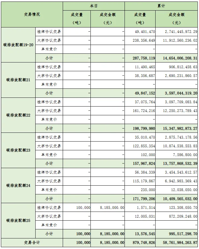 今日全国碳排放权交易市场成交总量100,000吨,成交总额8,185,000.00元,成交均价81.85元/吨。截至今日,全国碳排放权交易市场累计成交总量879,748,826吨,累计成交总额58,761,984,263.87元。