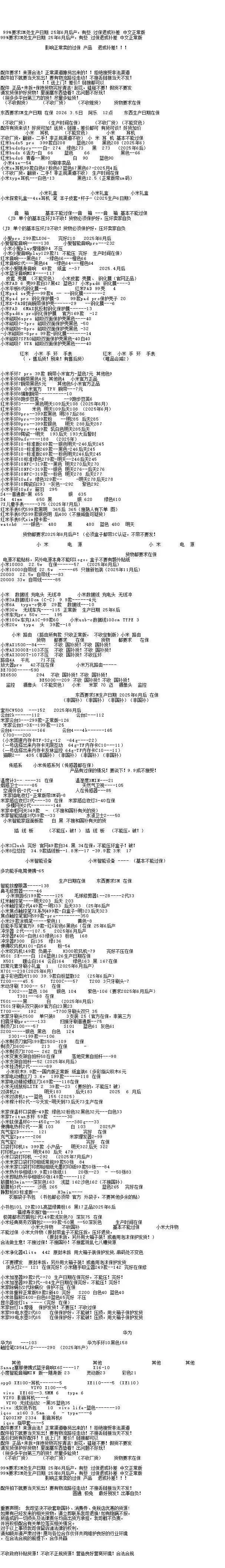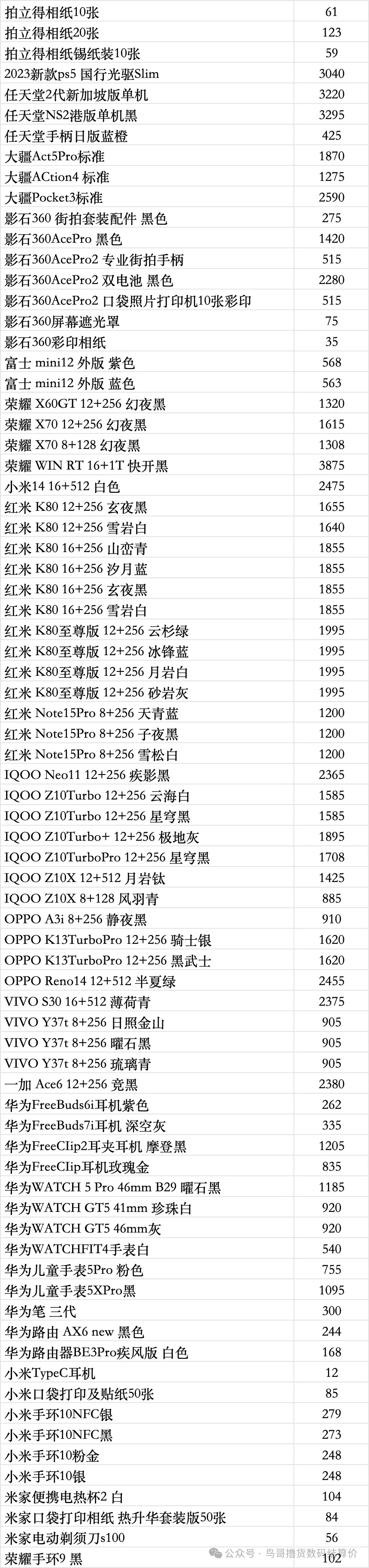 任天堂游戏机: 新款二代NS2港版标配机:3305 新款二代NS2港版马车机:3505,没游戏码:3240(注意下单要看有没有游戏码的 要不然就是便宜的) 新款二代NS2韩版马车机 没游戏码的:3170 新款二代NS2新加坡版 台版 单机:3210,就是没有游戏的 新款二代NS2韩版 欧版 美版 单机:3200,就是没有游戏的 新款二代NS2新加坡版同捆:3490 NS2港版宝可梦同捆:3570 OLED屏 日版白-1850 彩色-1950 OLED屏 港版白-1840 彩色-1920 OLED屏 国行白-1670 彩色-1670 2026年3月5日 华为配件全系列 行情参考 以结算价为准 所有货都不收国补的,一经发现就当送我们的 华为手表系列 华为 Watch FiT4 黑545白545绿555紫550银575 华为 Watch FIT4 pro 黑1145蓝1085绿1185 华为WATCH FIT 2活力款 黑色325粉325 华为WATCH FIT 3 黑435灰545月光白435原野绿455粉435薄荷绿445蓝435珍珠白495 Watch D2 黑 2865白2745蓝2745 Watch D2 药房版 2475 Watch buds 黑1135卡其色 1215 GT4 41m 白 795黑725草木绿00 GT4 46m 黑845棕00绿 00 Watch 4 黑 00褐 00白 00 Watch 4pro 棕 00火星钢00蓝00太空探索 00 Watch 5 46m 黑1820紫2175棕 2260蓝1865钛空银 2595 Watch 5 42m 黑1685白1805杏2255绿1725金2365 非凡2 黑5045蓝6015 非凡手表 黑3445蓝 00绿00 华为新款WATCH GT5系列 GT5 46黑1075蓝940棕915灰920 GT5 41 黑 925蓝895白915青860棕840 GT5pro 黑1175陶瓷2115钛钢色 1395冰川白1015 GT6 pro 黑1795棕2075钢2500 GT6 46m黑 1125灰色 1290绿色 1425 GT6 41m 黑 1025棕色 1405白色 1210紫色1030蓝1010 华为儿童手表系列 儿童4pro蓝500粉505 儿童5pro 蓝755粉750绿755紫755 儿童5X 蓝725粉725 儿童5Xpro 黑1090紫1100 儿童5 绿360紫360蓝415活力蓝340红340 儿童5星耀 粉410蓝425 荣耀,华为手环 荣耀手环9标准黑98蓝108紫108 荣耀手环9NFC 黑120蓝120紫120 荣耀手环10标准黑135绿135灰135蓝135 荣耀手环10NFC 黑155灰155绿155蓝150 华为手环系列 华为手环8标准黑108粉108 华为手环8NFC 黑110 华为手环9 黑155白145粉143黄 140蓝145 华为手环9nfc版 黑165白152粉150蓝150黄150 华为手环10标准 黑160粉160 华为手环10铝合金款 黑170白170蓝170紫170向新绿165原野绿160灰165 华为手环10NFC 黑190白197蓝195紫200绿193 B7 黑685灰680 华为耳机系列 华为Free Arc 绿395灰415黑415白385 华为 FreeBuds 7i 白337灰330粉337 华为freebuds6i耳机 白263黑270紫260 华为耳机Free clip2 黑1220白1215蓝1215金1220紫1220 华为耳机Free clip 黑色840暖星云925紫 830玫瑰金830 华为耳机FreeBuds 5i 黑210白217蓝217 华为FreeBuds se2 耳机 白71蓝73黑73紫73 华为 FreeBuds se3 黑101金101白98 华为 FreeBuds Se4 白149黑149 FreeBuds 6 白510黑515紫515金510 FreeBuds 4e 2024款 白290银290 FreeBuds pro5 白1075银1105金1105蓝1115 FreeBuds pro4 黑715绿695白730 华为CD56 pro笔 465 华为CD57 黑265白275 华为CD54S 三代笔295 华为 三代笔充电器 78 Wifi5 黑175白175青173 WiFi3 pro 265 AX3 120 AX6 new 243 AX3 pro new 197 AX3 pro WiFi7 187 BE3pro 千兆版 180 BE3pro 疾风版 167 BE7pro 405 AX2pro 103 荣耀手表 荣耀手表4pro 黑725棕825绿795 荣耀手表5pro 蓝牙版黑1075灰1075 荣耀手表5pro 插卡版黑1175灰1175 荣耀手表5Ultra黑1195棕1445钛金属1895 荣耀手表5 黑525金525 移动电源 华为22.5w se 移动电源 黑85白90 华为66w 电源 白180蓝190 |