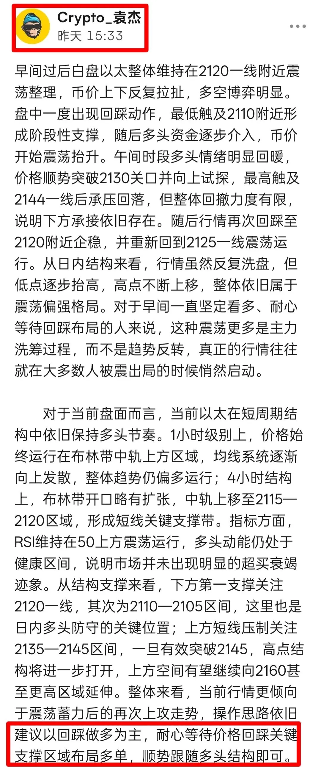日内大饼和以太行情整体呈现出典型的“冲高回落、震荡下行”的结构节奏。早间凌晨阶段,大饼币价一度拉升至 74000上方,多头情绪短暂释放,但随后高位承压明显,市场未能形成有效延续性突破,日内逐步进入震荡回落通道。随着晚间阶段资金分歧加剧,价格重心持续下移,晚间多次反抽均未能站稳关键均线压制,空头逐渐占据主动,最低回落至 70750附近。以太坊走势与大饼基本同步,早间最高触及 2199附近后同样出现明显回落,盘中多次尝试反弹均受制于中轨及均线压制,晚间空头发力一度下探 2055附近。日内盘中多次回踩关键支撑后出现技术性反抽,而我日内连续给出的思路主要围绕 回踩低多布局,在价格回落至关键支撑区域时顺势介入,多单在反弹过程中成功兑现,也顺利吃到了一段结构性的反弹空间。从全天结构来看,市场情绪明显从高位追涨逐步转为谨慎甚至恐慌,不少人在日内反复震荡中被来回收割,这也是震荡行情中最常见的洗盘节奏,真正的趋势往往是在多数人失去耐心之后才逐渐显现。