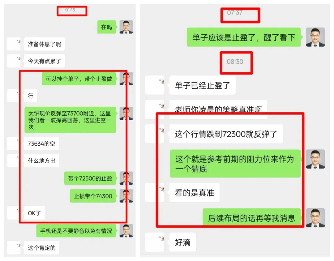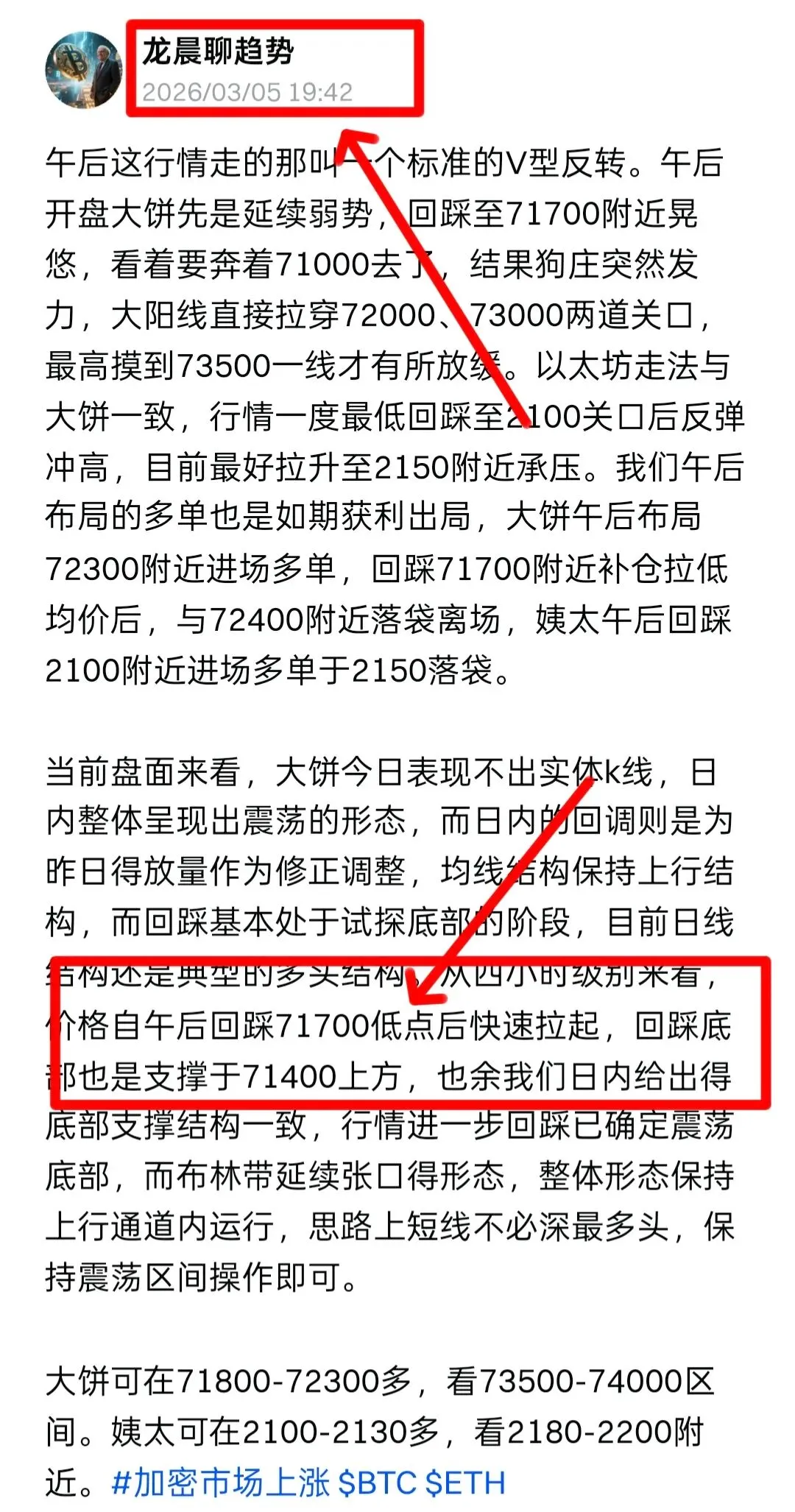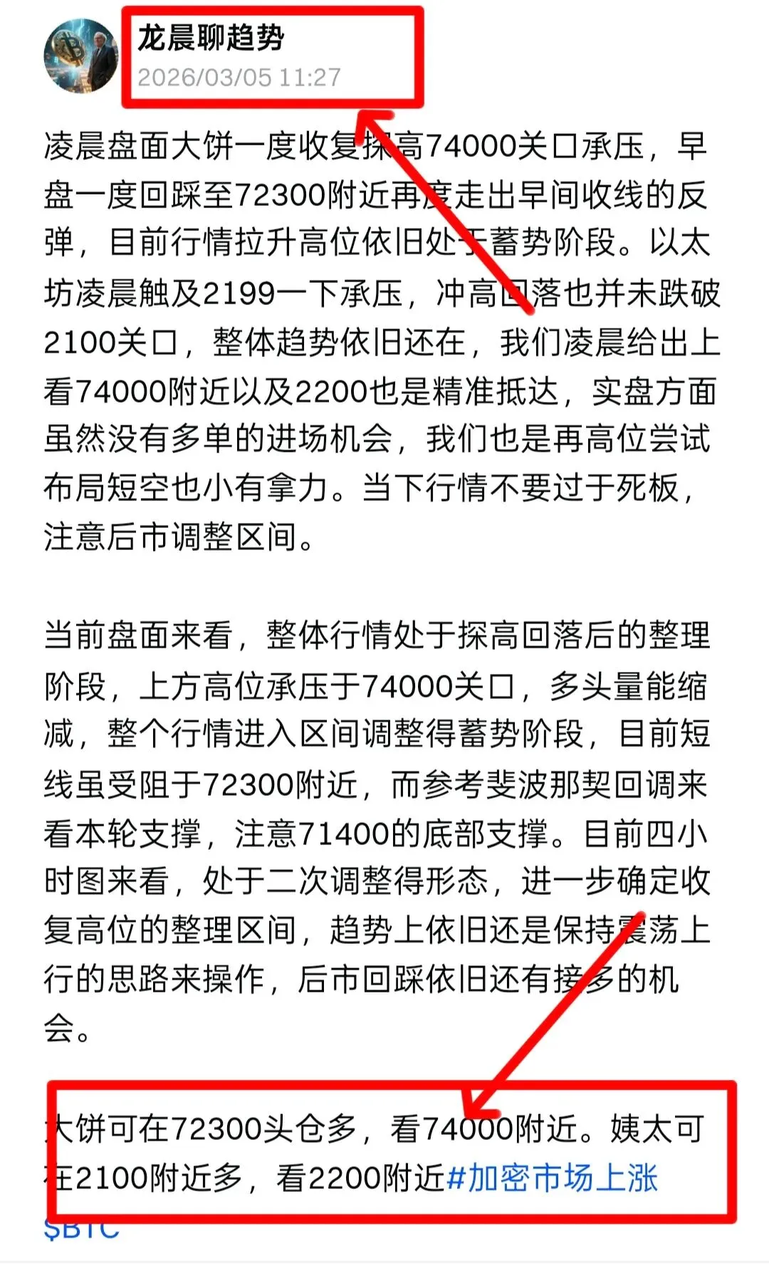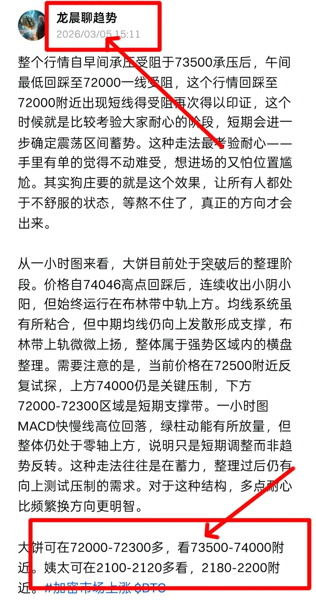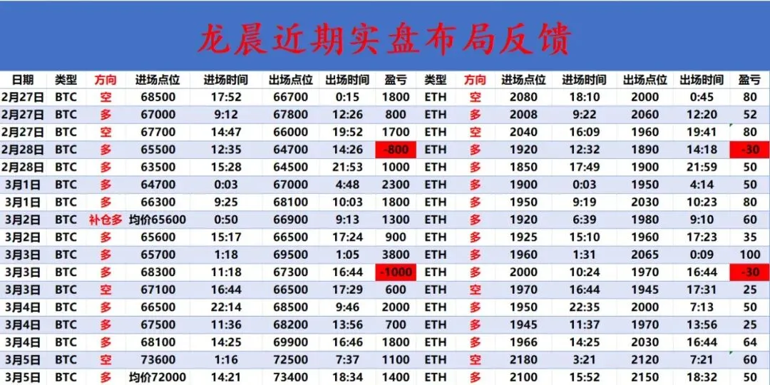 早间大饼还在73000附近晃悠,午后开始阴跌不止,一路从73000磨到72000,晚间更是直接加速下探,最低跌至71200附近才勉强稳住,晚间收线后再度破位关键支撑结构。以太坊大饼走法几乎一致,日内反弹承压于2150一线回落,比价承压走低,晚间美股开盘后迎来深调至2050附近。日内我们也是秉承着探高回落看调整得思路,回踩低位布局多单,日内布局两单斩获2500点空间,姨太布局两单斩获110点空间,晚间美股开盘后,我们的短线接多也小有获利,但获利相对较少不计入实盘统计。