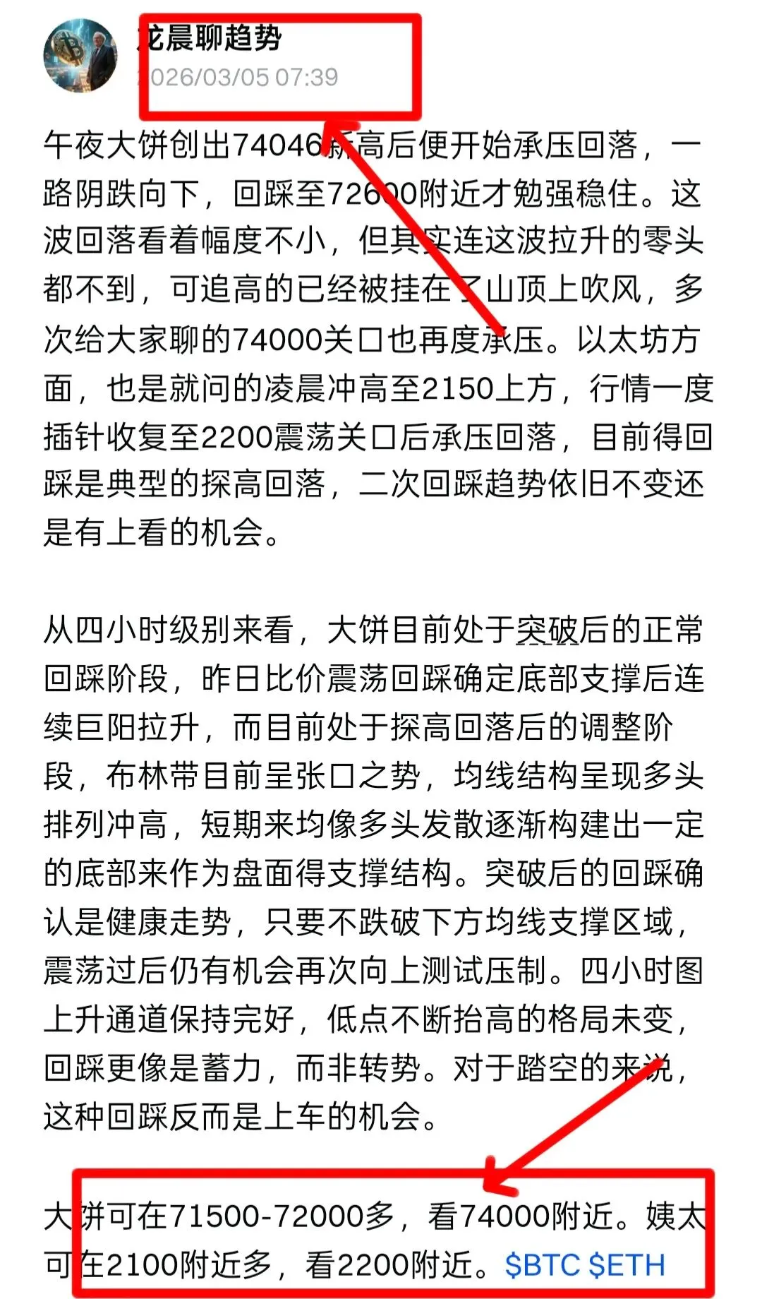 从日线级别来看,今日收阴已成定局,但整体仍处于上升趋势中的正常调整。日K线虽跌破5日均线,但下方10日、30日均线仍在向上发散形成支撑。前期突破后的回踩确认是健康走势,只要不跌破日线级别的关键支撑位,多头结构就不会被破坏。目前的回调更多是为了清洗浮筹,为下一波拉升蓄力。结合四小时级别来看,大饼目前处于突破后的回调阶段。价格自74046高点回落后,连续收出阴线,目前已跌破前期整理平台,触及布林带中轨附近。均线系统虽仍呈多头排列,但短期均线开始拐头向下,MACD快慢线高位死叉,绿柱动能持续放量,说明短线还有进一步回踩的需求。下方关键支撑关注70000-70500区域,这是前期突破后的成交密集区,也是四小时上升通道的下轨位置。后市思路上还是秉承大趋势回撤机会看涨。