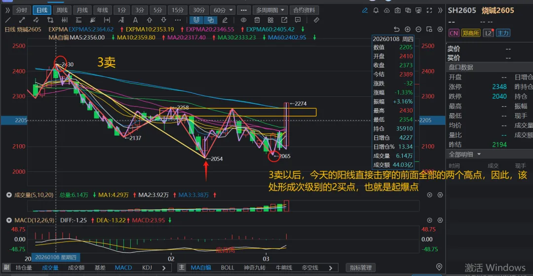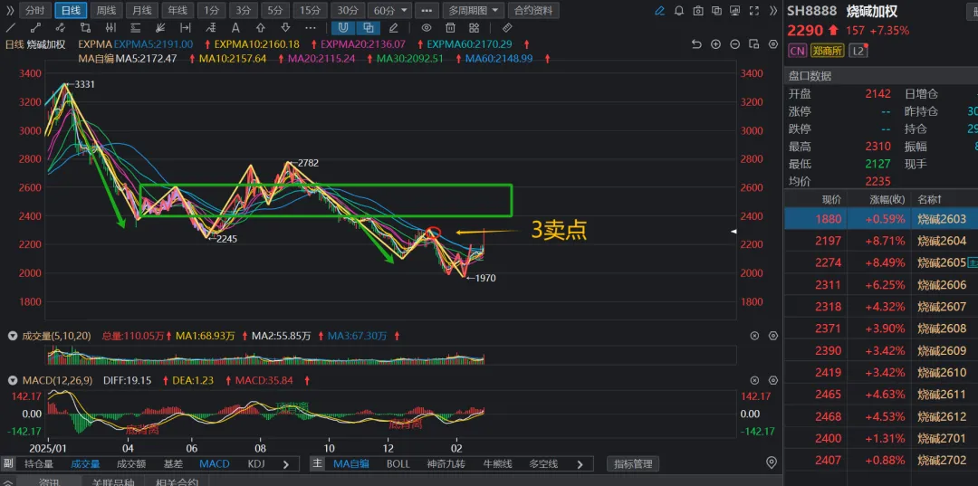 好,现在直接去烧碱2605合约上看,3卖以后,今天是一个大阳直接击穿了前面两个高点,因此3月3日的2065点就是次级别的2买点,也就是起爆点