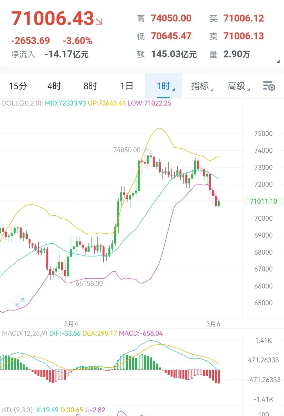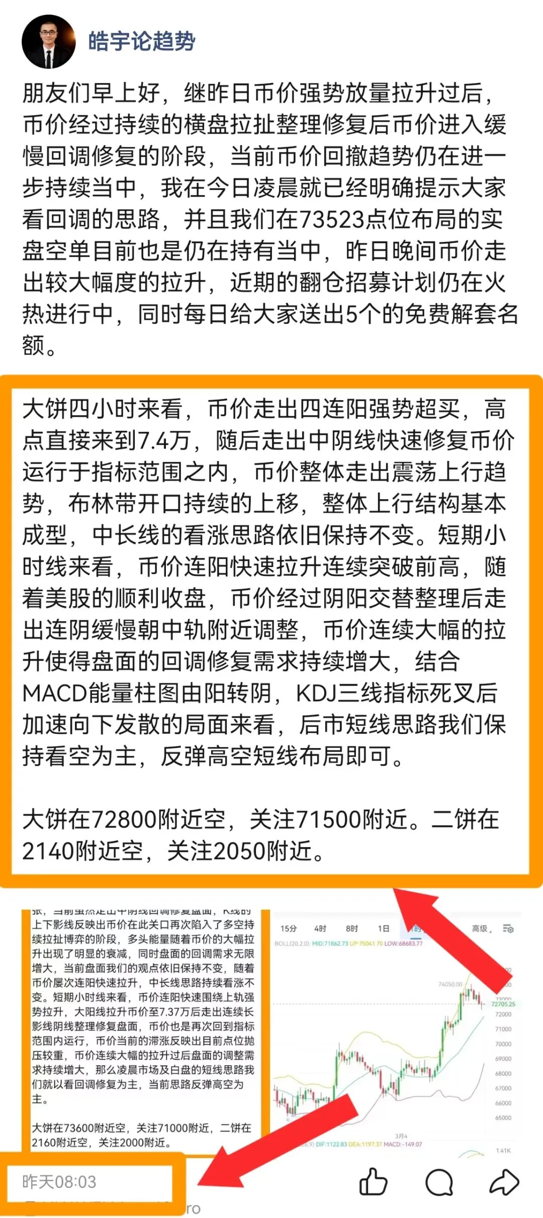 回顾日内行情,币价强势冲高刷新前高7.4万后走出持续的缓慢回调,午后币价下行受阻给到一定的反弹后币价再次延续了此前的回调趋势,晚间跟随美股节奏币价再次走出加速下调,当前币价运行至7.1万关口下方,早间及午后的看空思路也是反弹提示大家,日内的实盘布局空单也是再次精准拿下,还是那句话,你关注我的策略就只能是反复懊恼没有跟上,持续的看别人吃肉,本周的实盘截止目前以仅一单打损的战绩笑傲币圈,近期操作不理想的朋友不妨直接跟上节奏,皓宇有信心带你快速走出当前的窘境。