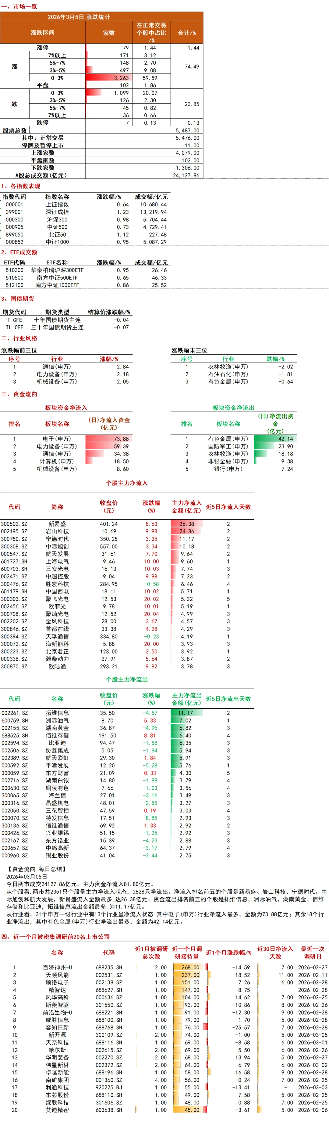 :市场呈现“科技成长领涨、避险资产回落”的分化格局,主力资金集中流入电子与电力设备行业,地缘冲突预期变化主导资源股波动。指数冲高回落显示多空分歧加剧,短期需关注量能变化及政策催化方向。