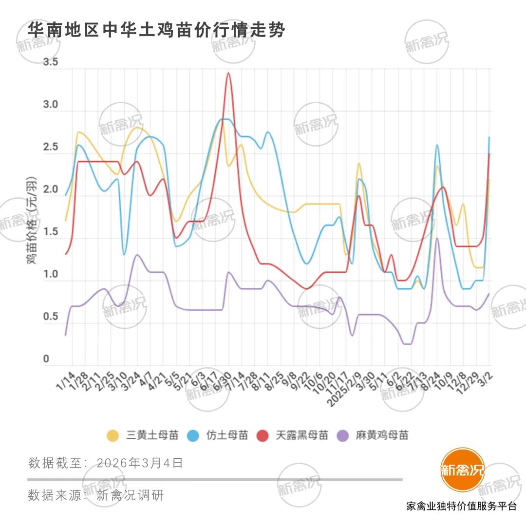 据新禽况调研,上周(2月23日―3月1日),华南、西南地区天气回暖,脱温鸡启动,节后补栏需求增强。苗鸡产出处低位,种鸡产能下降,供需关系反转,推动苗价稳步上行。