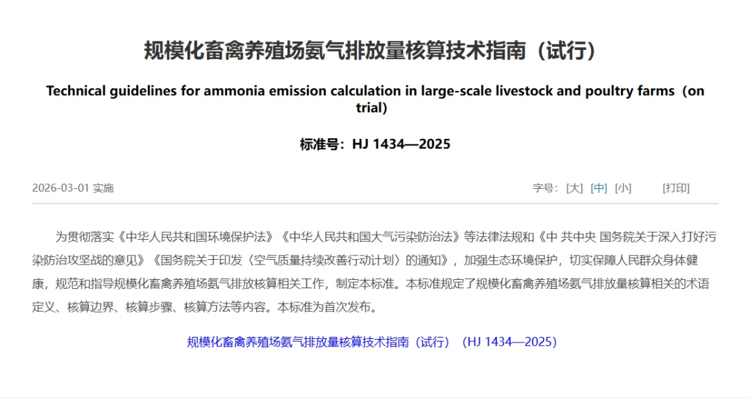 据生态环境部发布,国家生态环境标准《规模化畜禽养殖场氨气排放量核算技术指南(试行)》将于2026年3月1日起在全国正式实施。