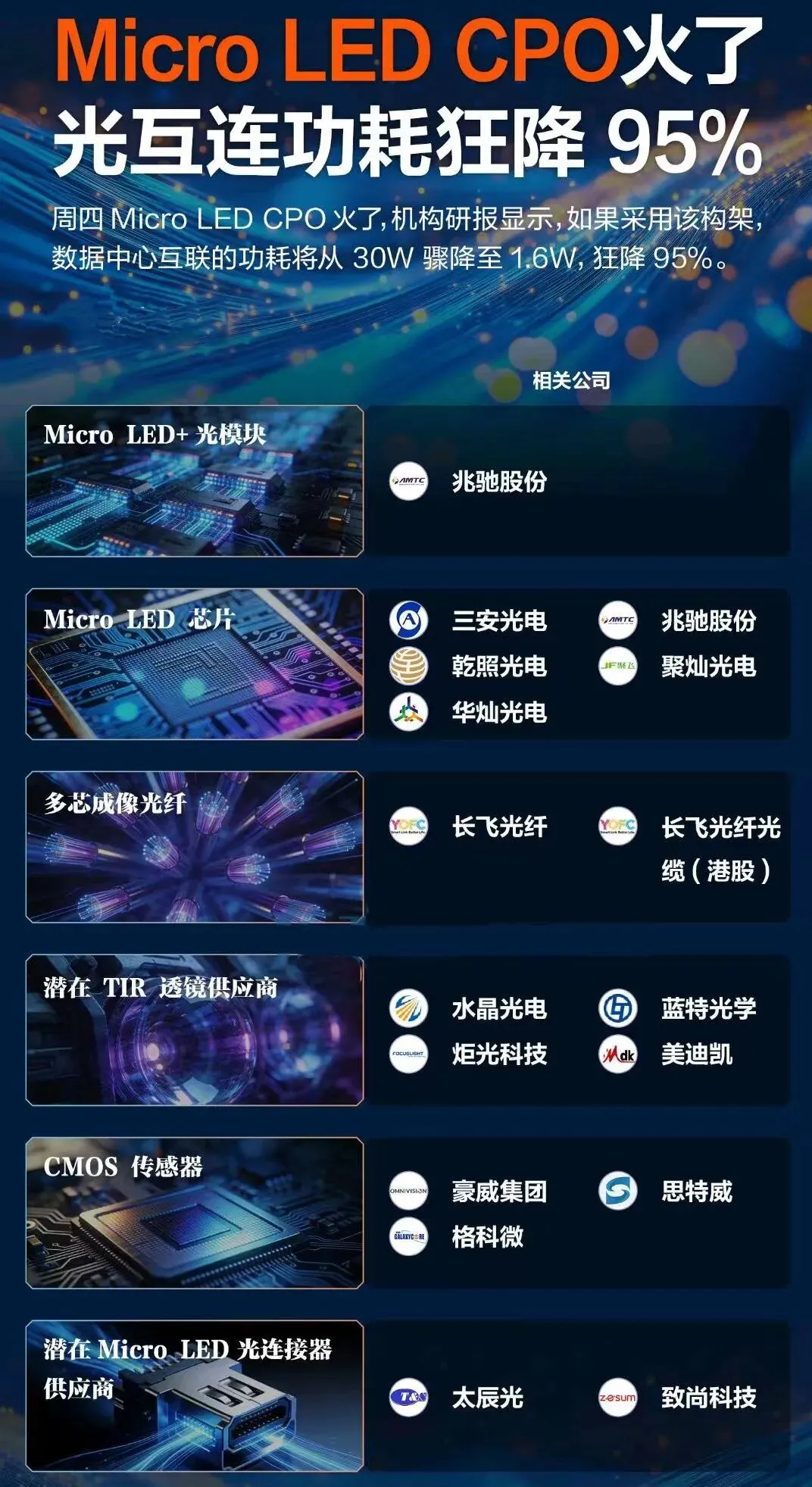 逻辑:根据TrendForce最新观点,Micro LED CPO方案的单位传输能耗较低,可大幅降低整体能耗至铜缆方案的5%,有望凭节能优势成为光互连替代方案。