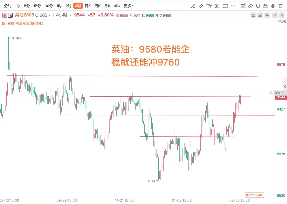 两会今天是第二天了,很明显第一天的预期不佳,村里的工作计划依然支持推荐交通,能源,水利等传统基建升级,但是并无明确的项目公开,这样的官话未能提振市场对需求的增量预期,连螺纹都没有能够有效企稳关键阻力3085之上,焦煤仍未能摆脱1135-1075的震荡区间,铁矿石在国际盘多头的带动下冲破了757的阻力,757-755区域则从之前的阻力转变为支持,所以隔夜我们在755区域参与了北上的布局,接下来就看多头能不能延续冲高的力度了,玻璃依然偏弱,关键阻力线仍承压,纯碱相对强于玻璃,支撑线上就偏强对待吧!整体黑色系仍处于分化状态,分开对待和布局,不要相互受影响!油脂板块:棕榈油,豆油,菜油,马棕油: 马棕油的走强推动了整个油脂板块分化的盘面终于走出了同步的多头,但目前豆菜油面临阻力压制下市场情绪仍不团结,若能打破短期的关键阻力则有望进一步去测试前高阻力,棕榈油的双底形态仍是提振整个油脂板块的核心,目前也正在按照预期前行,同时豆油8300如期守住短线若能冲破8400,那么多头就还能去测试前高8570区域,菜油未能回落测试9370的机会,短期若能打破9580的关键阻力将去测试9760!整体油脂按多头对待!豆一: