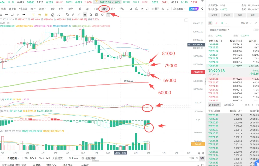 今天周五,周六周天两天过完就周线收官,目前的BTC周线区间可看5-10日均线之间的价格69000-79000,周线KDJ和macd都是拐头向上即将形成金叉的迹象,周线上可低多布局