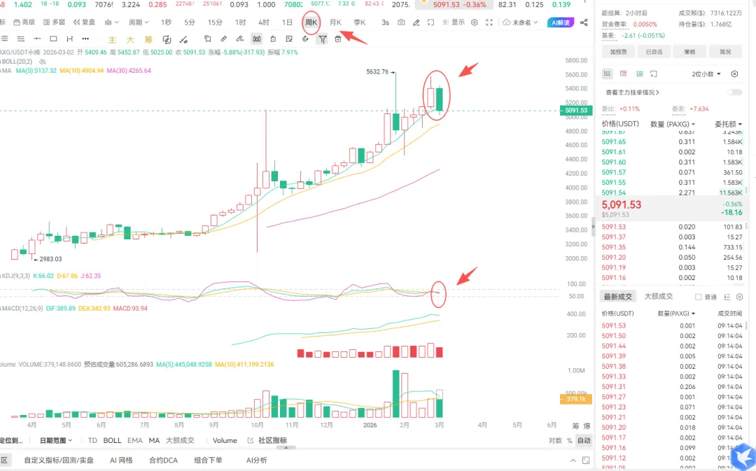 黄金现在技术面上又和大饼是背驰的,之前我看比特币是空,黄金是多,现在来看,黄金的趋势是空,从我们周线上来看,黄金出现了阴包阳的K线形态,走线把上周的涨幅全部吃掉,目前价格在5100附近