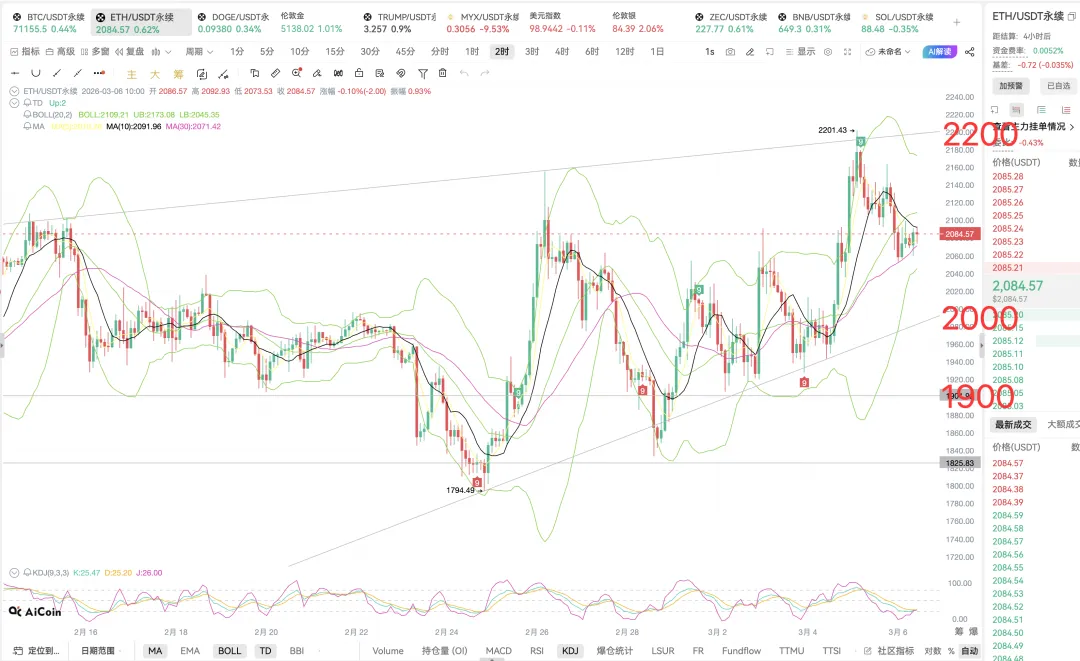 技术面12小时布林带缩口,早间收取一阴,回到上轨下方运行,目前是4连阳收阴,大趋势可以继续看空,目标关注中轨2000附近,再考虑是否转向做多,但大趋势交易建议高空为主。4小时目前同样支撑于中轨2050附近开始上涨,中午如果收取一样,将是3连阴收阳,下午可以继续看涨,关注上轨2180附近压制。另外MACD金叉但红柱缩量,多头动能减弱;4小时MACD金叉但红柱缩量,多头动能减弱。综上,短期以太有一定反弹趋势但空间有限,大趋势交易继续高空为主。