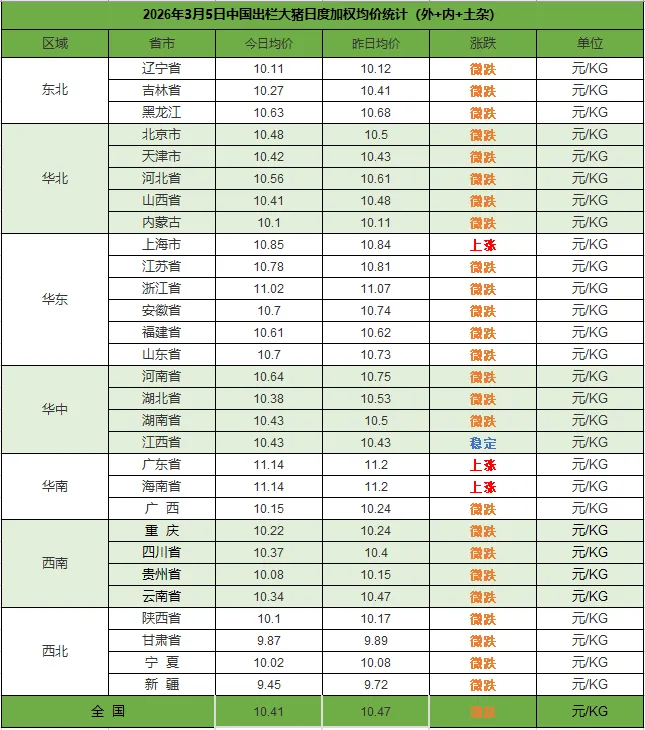 2026年3月5日,中国主流市场出栏外三元、内三元及土杂商品大猪加权日均价较昨日价格稳中有涨,全国生猪出栏加权日均价10.41每公斤,较昨日价格下跌0.59%。当前供应端偏宽松,前期压栏大猪、规模场出栏增加叠加冻品库存偏高,市场供给充足;需求端处于节后淡季,消费偏弱、屠企持续压价收购,养殖端亏损扩大。预计近期仍低位震荡。今日全国外三元、内三元及土杂猪均价如下:1) 主流市场外三元大猪全国销售均10.52元每公斤,较昨天价格下跌0.52%;2)主流市场内三元大猪全国销售均价10.12元每公斤,较昨天价格下跌0.87%;3)主流市场土杂大猪全国销售均价9.75元每公斤,较昨天价格下跌0.59%。