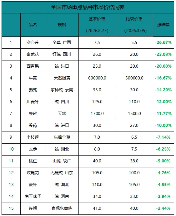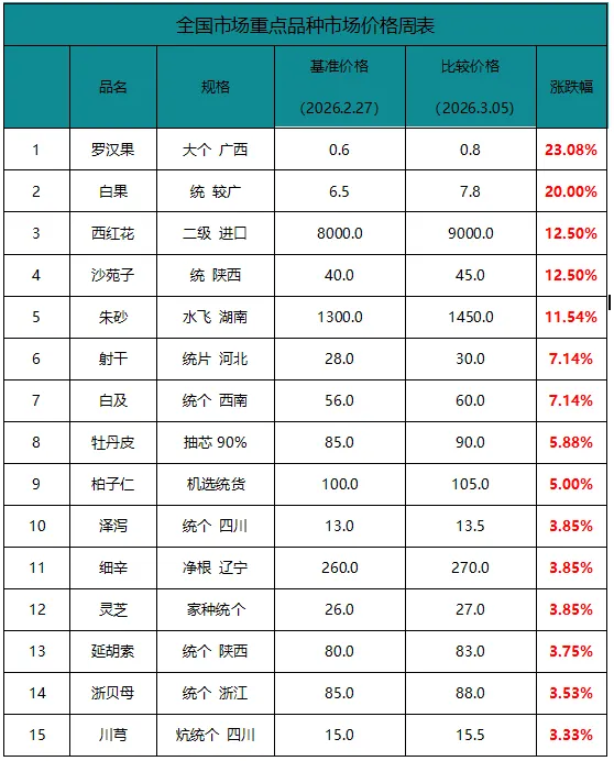 市场呈现出“涨跌互现、回暖面扩大”的节后复苏特征。一方面,部分节前库存薄弱的品种(如罗汉果、白果、沙苑子)延续坚挺态势;另一方面,产新品种及供应充足的品类(如穿心莲、密蒙花、麦冬)仍面临下行压力。市场整体处于节后交易恢复与春季产新预期的交织阶段。