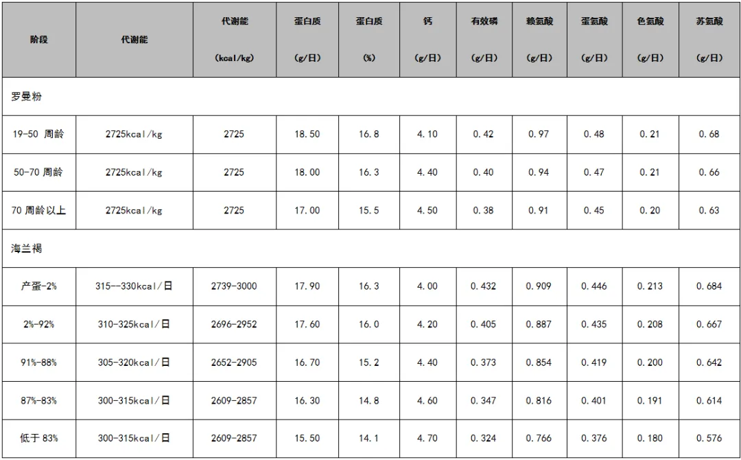 参考蛋鸡产蛋期的平均日采食量范围105-115g/羽。我们选择其中一个品种一个阶段进行确定,以罗曼粉(50-70周龄)为例,采食量105-115g/羽基础上,代谢能需要量2725kcal/kg,蛋白质需要量16.3%(15.7-17.1%),能蛋比是167(159-174)。