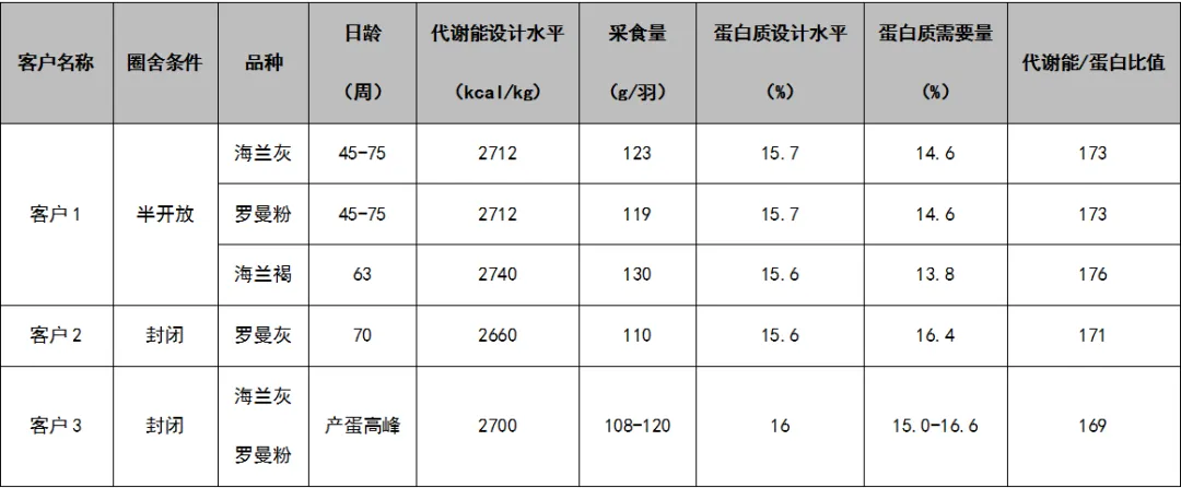 结合以上关于育种手册值、实际客户应用值、以及文献报道,建议产蛋期的能蛋比170-177,基础营养水平设计值:ME2700-2750kcal/kg,CP15.6-16.3%