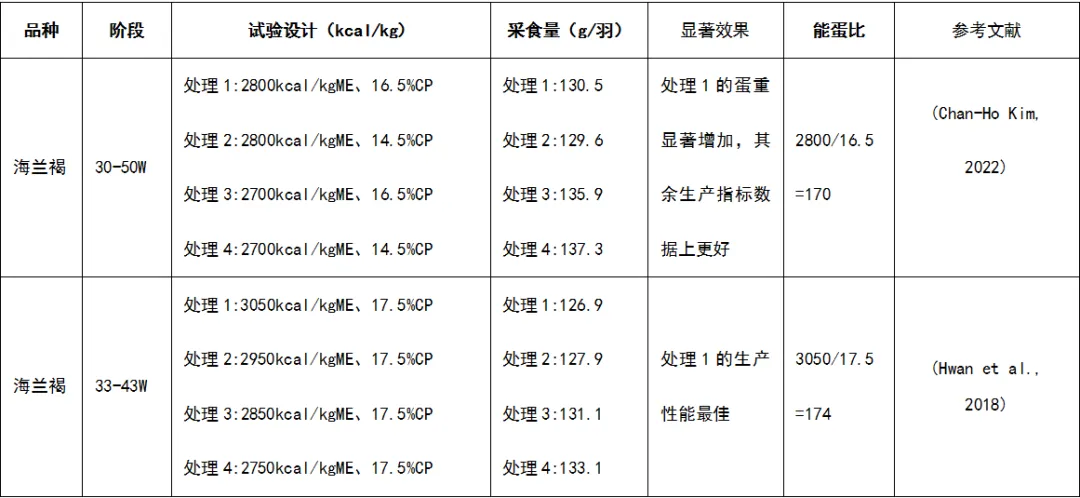 关于能蛋比的文献较少,基本是以褐壳蛋鸡(海兰褐)进行设计,文献中设计的绝对代谢能和蛋白水平较实际应用高出很多(详见下表),但是可以参考能蛋比范围170-174。