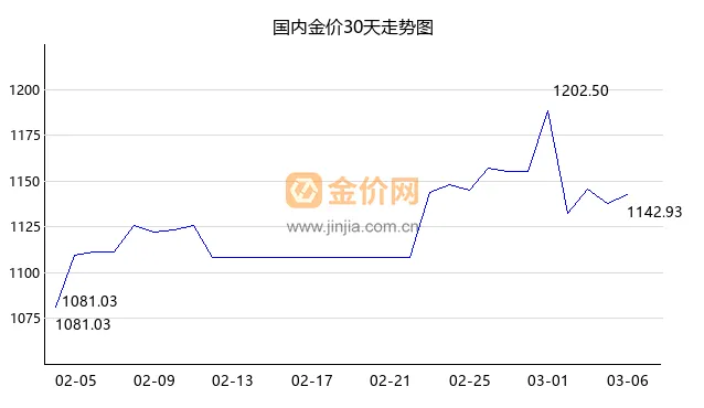 今日国内金价下跌,现价1141.78 元/克,下跌-0.61%,今日开盘价1149.98,最高价1151.00,最低价1130.04。
