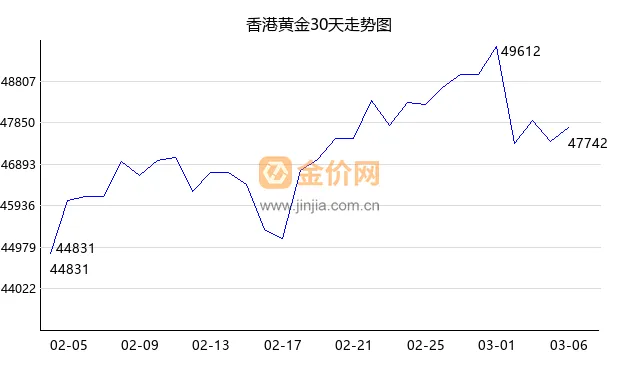 今日香港黄金上涨,现价47676 港币/两,今日开盘价47298,最高价47854,最低价47125。