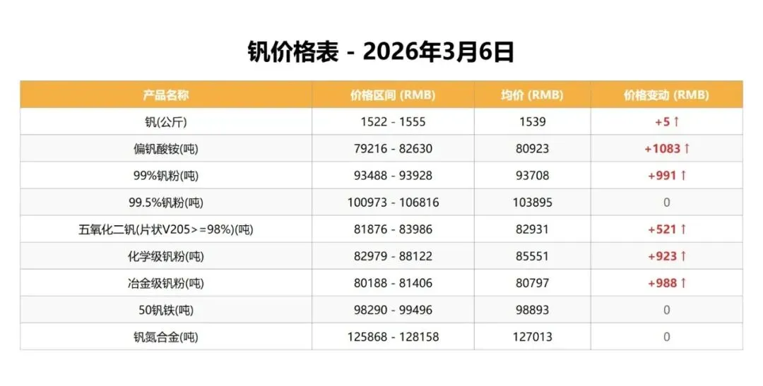 今日钛产品市场整体平稳,所有品类价格均未发生变动。钒产品市场涨跌互现,多数品类价格小幅上涨,但99.5%钒粉、50钒铁和钒氮合金价格保持稳定。钒荣网旨在汇聚钒钛产业链上下游企业,钒荣网将通过资讯浏览推送、“双碳”产业、在线交易推广、技术成果转让、产业金融、钒产业指数、行业标准会议会展、咨询服务数据报告等功能板块,为钒储能上下游企业提供商机对接、行业资讯、产业金融、市场拓展、名企研学、品牌宣传、数据服务、专属顾问等服务。