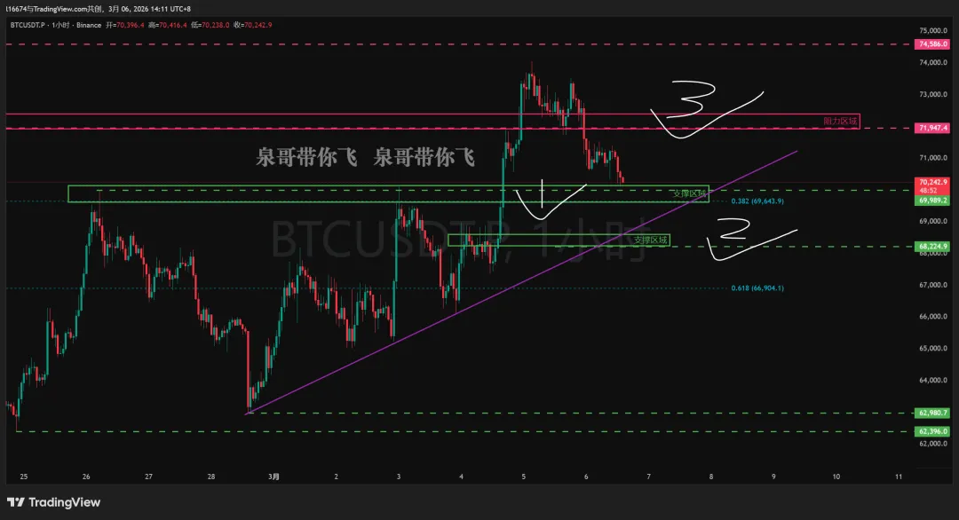 1、目前还未看到漂亮做多信号,等测试支撑+0.382(69643附近)