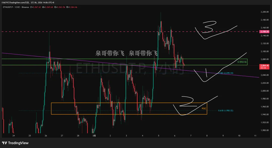 ETH 留意0.382+趋势线+支撑区域(2045附近),注意这区域会不会出现做多信号,这里要是跌破就不做多了,继续下跌到0.618(1950附近),空单在手的可以抱紧。