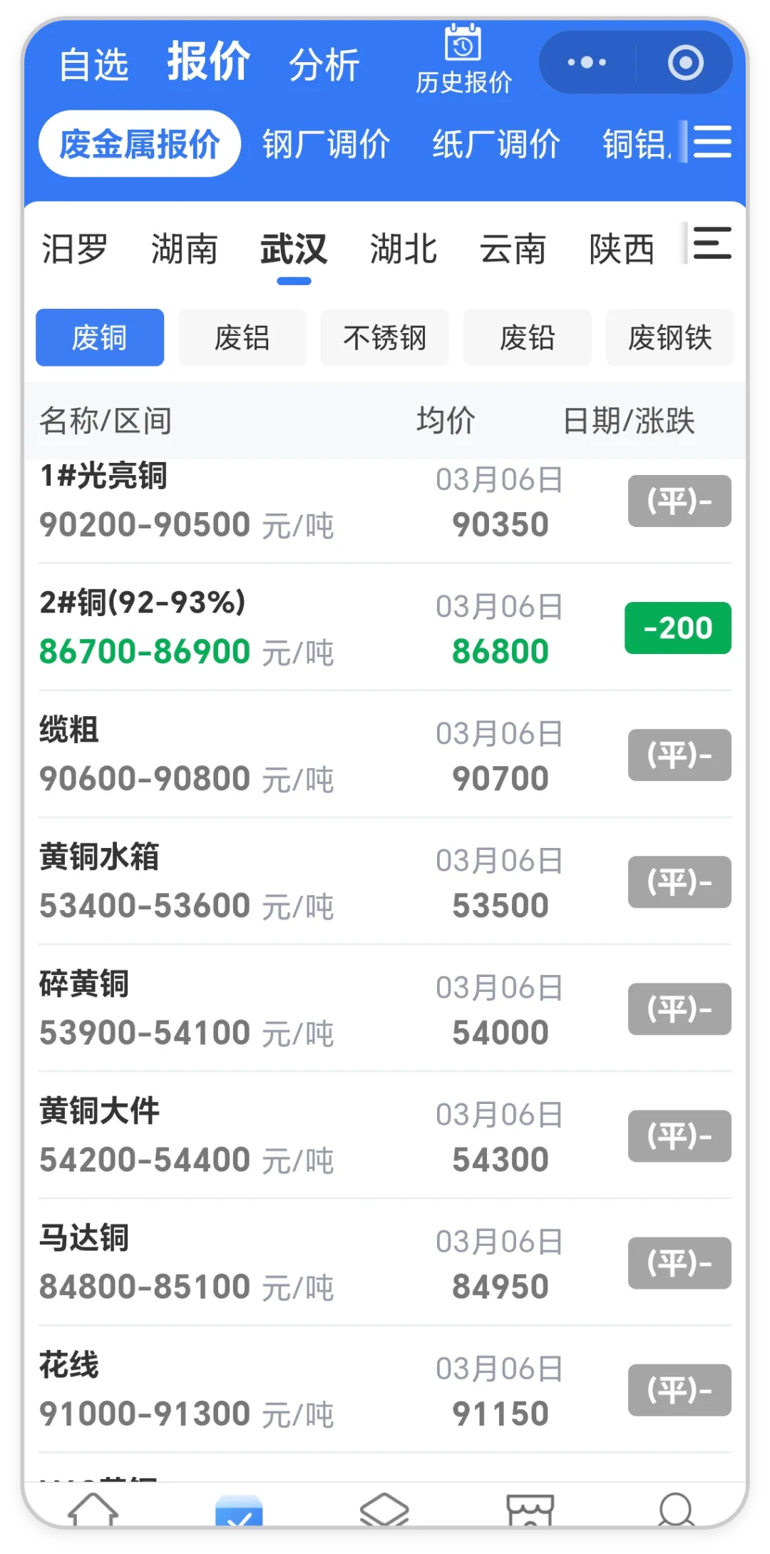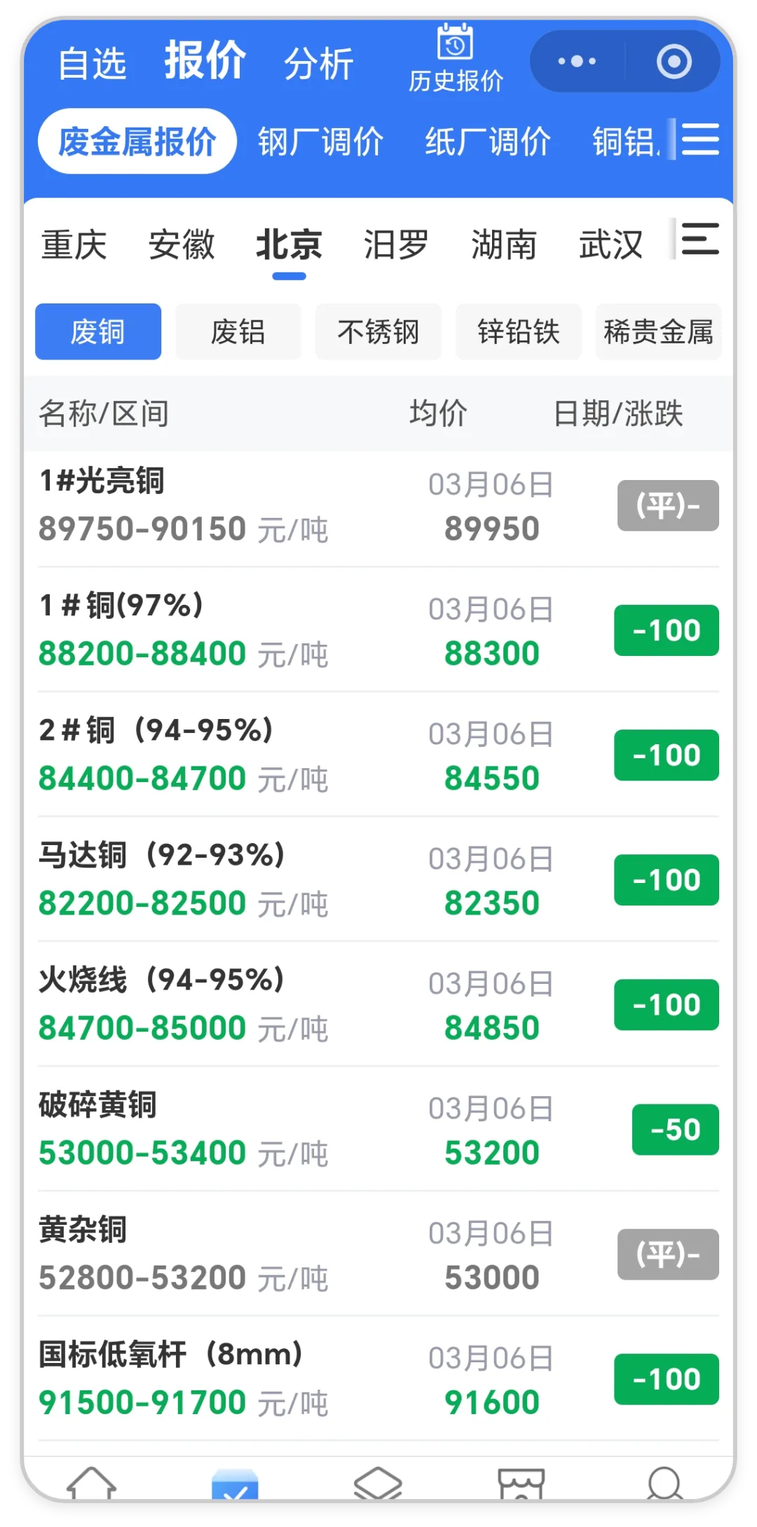 铜价行情今日铜价下跌,铝价下跌【2026.03.06】