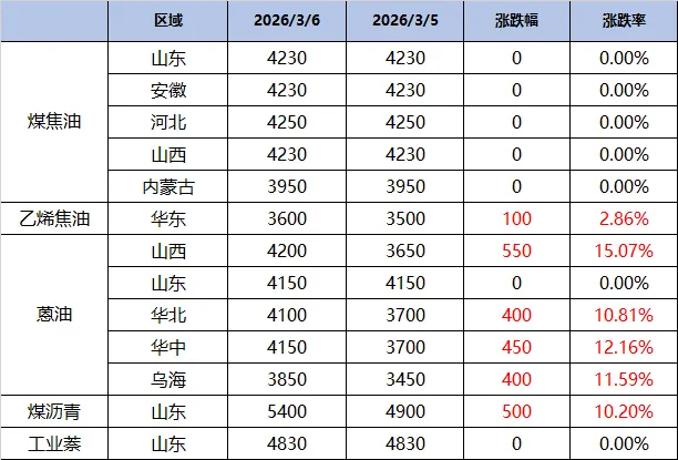 受煤焦油宽幅上行提振,煤焦油产业链全线飘红,多区域蒽油价格上行,煤沥青价格宽幅上涨500元至5400元/吨。
