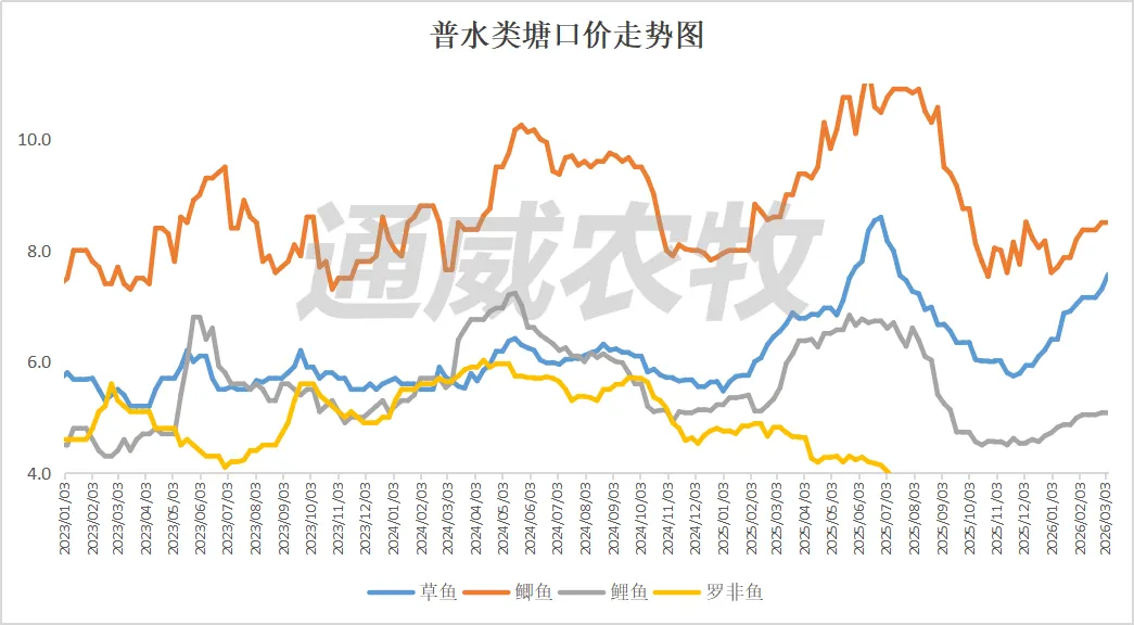 湖北地区因2斤以下小规格鱼存塘占比相对较大,受节后需求减少影响,价格呈现小幅下降趋势,大规格鱼供应偏紧,价格相对稳定。四川地区叉尾陆续发病,价格承压下行,2斤左右规格报价9.2元/斤,较上周回落0.3元/斤;江门地区受节后需求减少影响,1.5斤价格8.3元/斤,较上周下跌约0.7元/斤。河南郑州地区2斤价格约9.5元/斤。