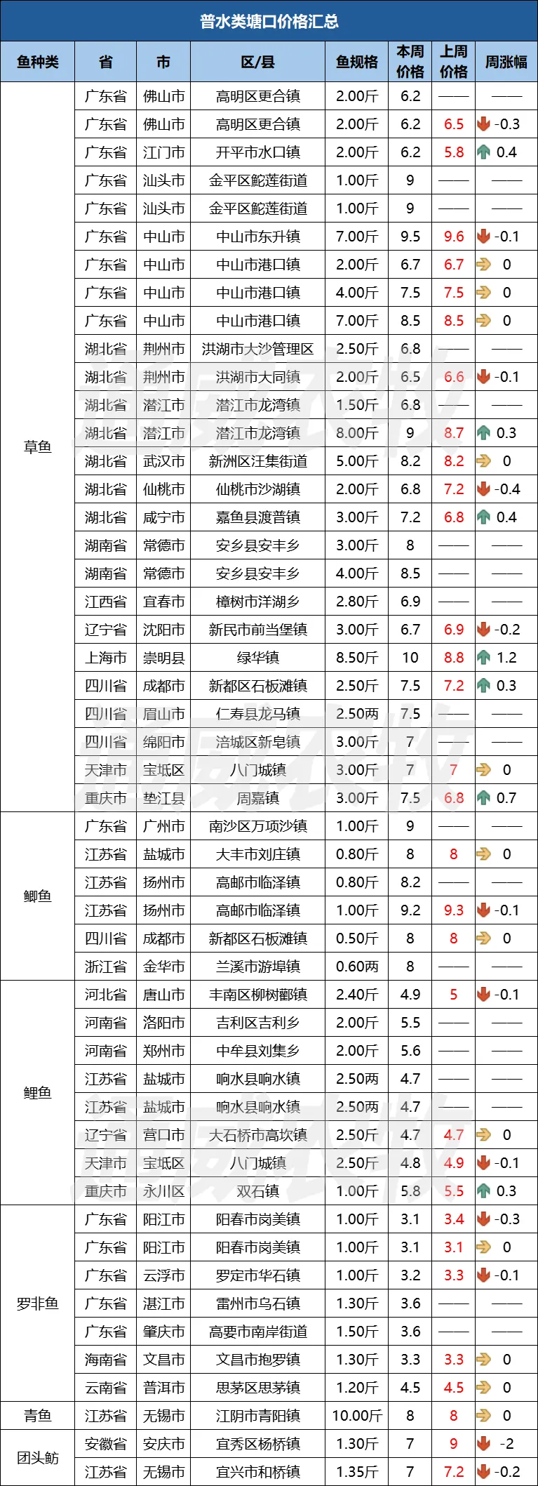 本周广东生鱼因中批鱼供应量充足,行情持续走低。佛山地区2斤以上占6.5成的统货价格约7.2元/斤,较上周下跌0.6元/斤。中山地区2斤以上占7成的统货价格约7.3元/斤,较上涨下跌0.3元/斤。