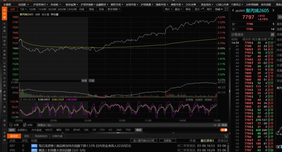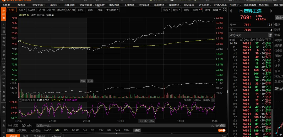 聚丙烯期货创了本周新高,最高点站上了7800的位置,收盘7797;塑料期货同样创了本周新高,基本7700的位置,收盘7691;K8003类,薄壁注塑等聚丙烯类产品市场报价已经到8000以上的位置;那么全线的聚丙烯原料产品突破8000的报价也是概率很大;-------------------------乐观者等来利润,悲观者避开风险;风一起又一起,浪一波又一波,起起伏伏,只等那个浪头; 我看到的只是我看到的,你看到的或许我没看到,一家之言难免片面;敬请指正,可以私聊。 【高山记叙于03月06日18点00分】